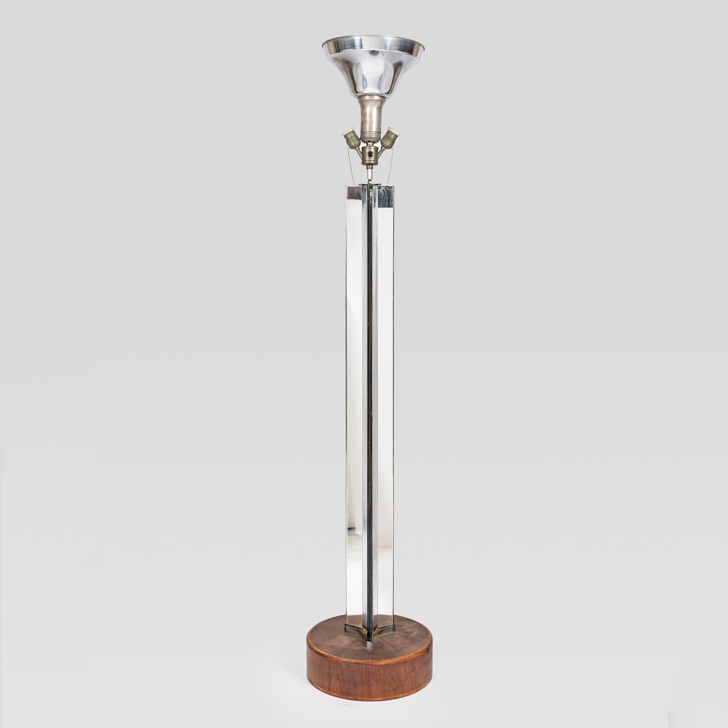 anni 40 lampada da terra in legno, vetro specchiato e metallo
