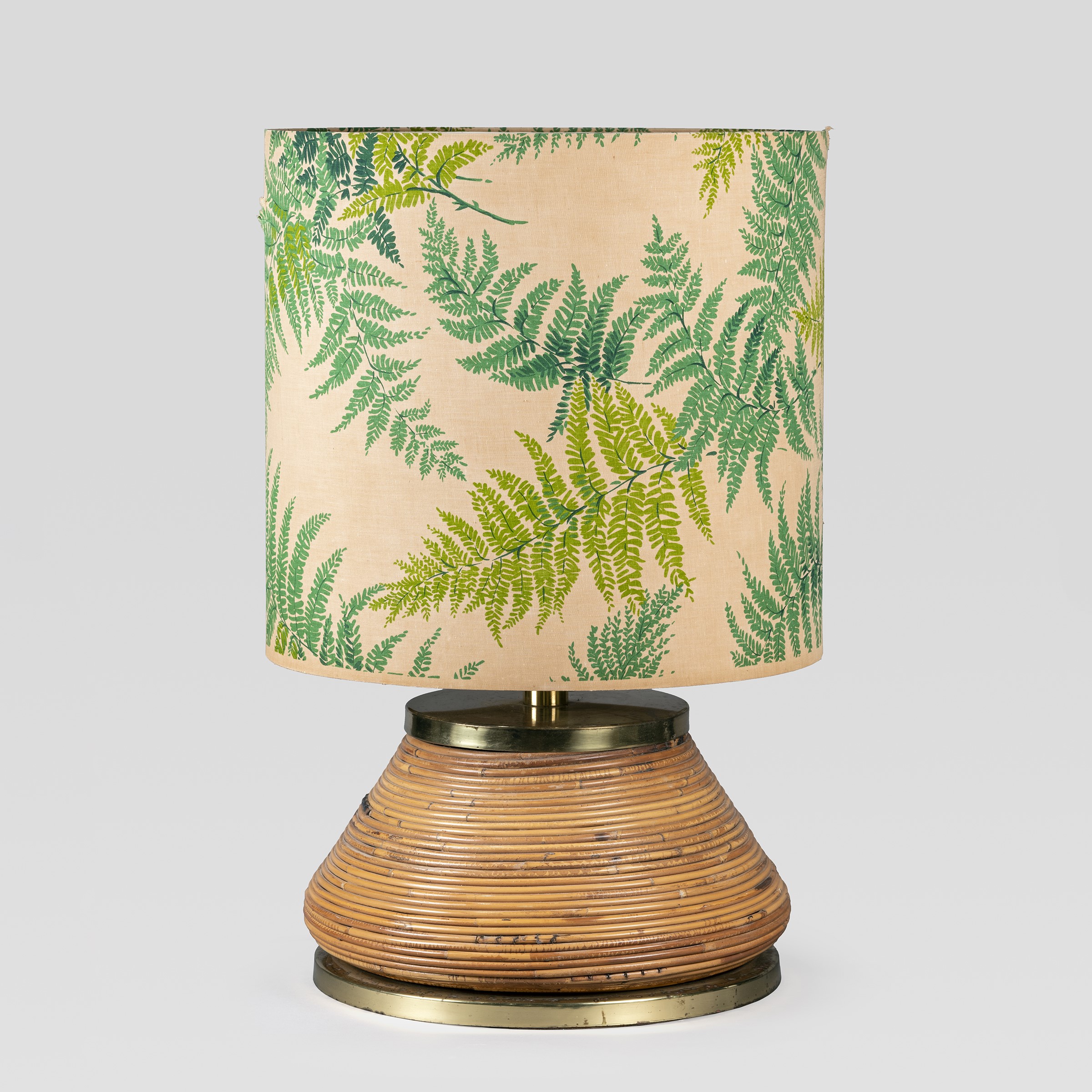 anni 50-60 lampada da tavolo in midollino e ottone, completa di paralume in tessuto