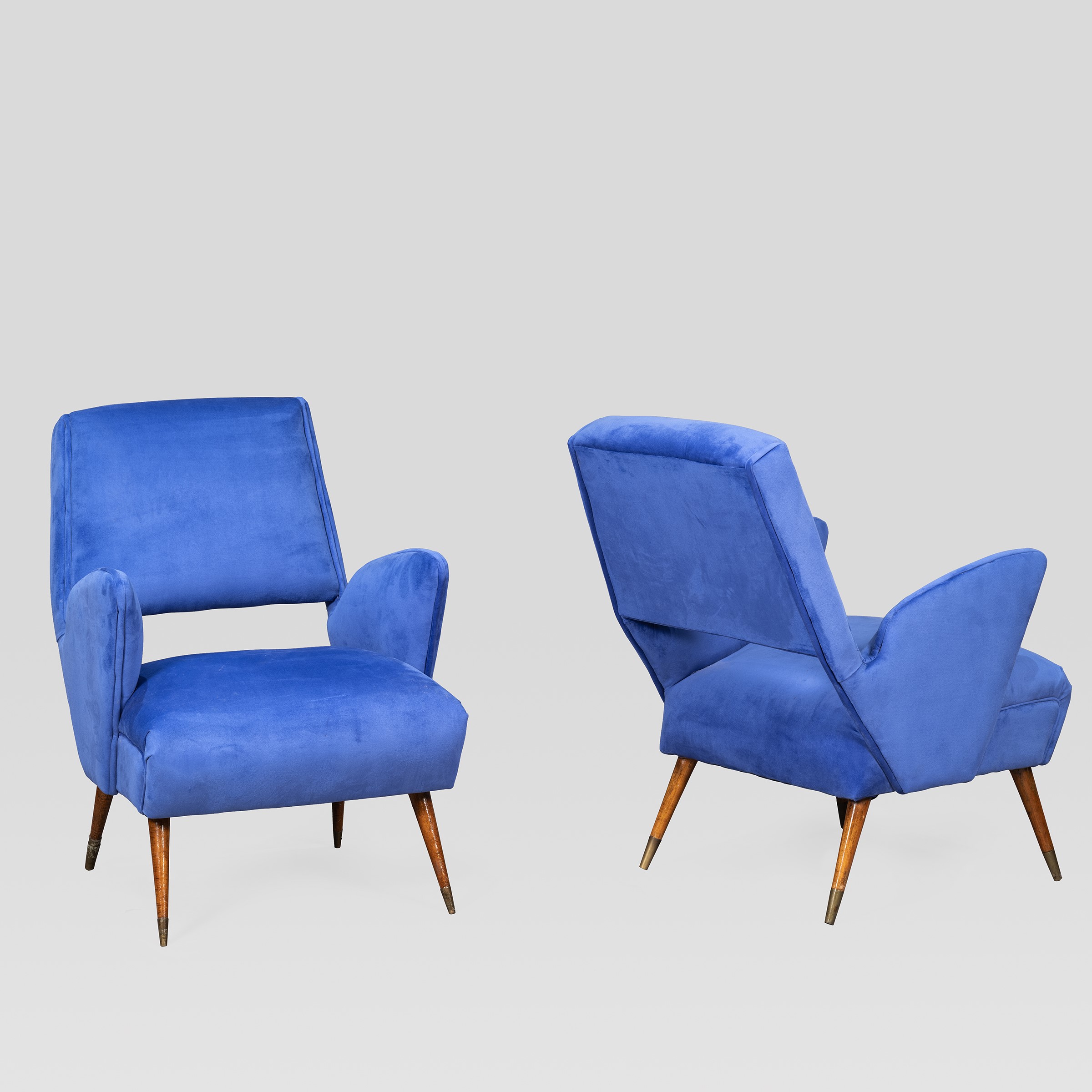 Italia, anni 50 coppia di poltrone in legno, ottone e tessuto imbottito