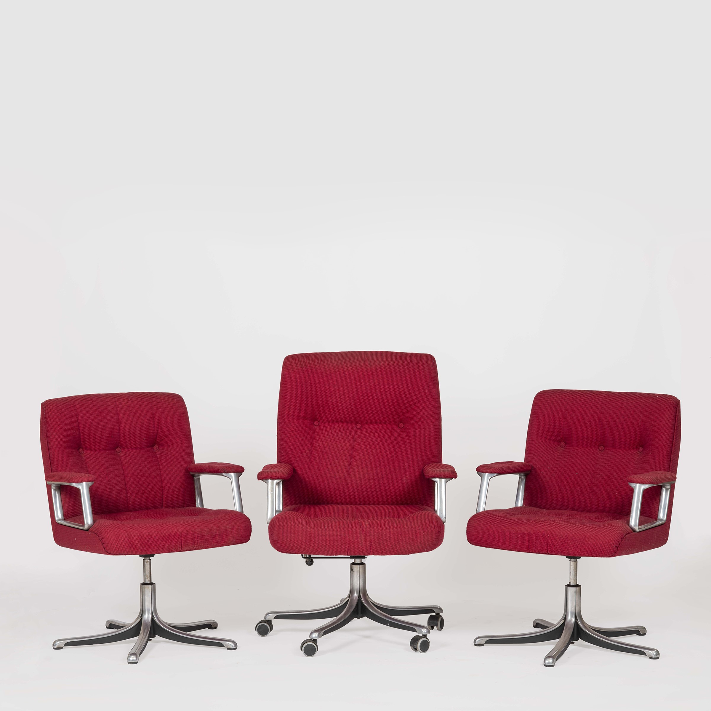 Italia, anni 70 due sedie e una poltrona girevole da scrivania mod. P128 in alluminio e tessuto imbottito, marchi della produzione