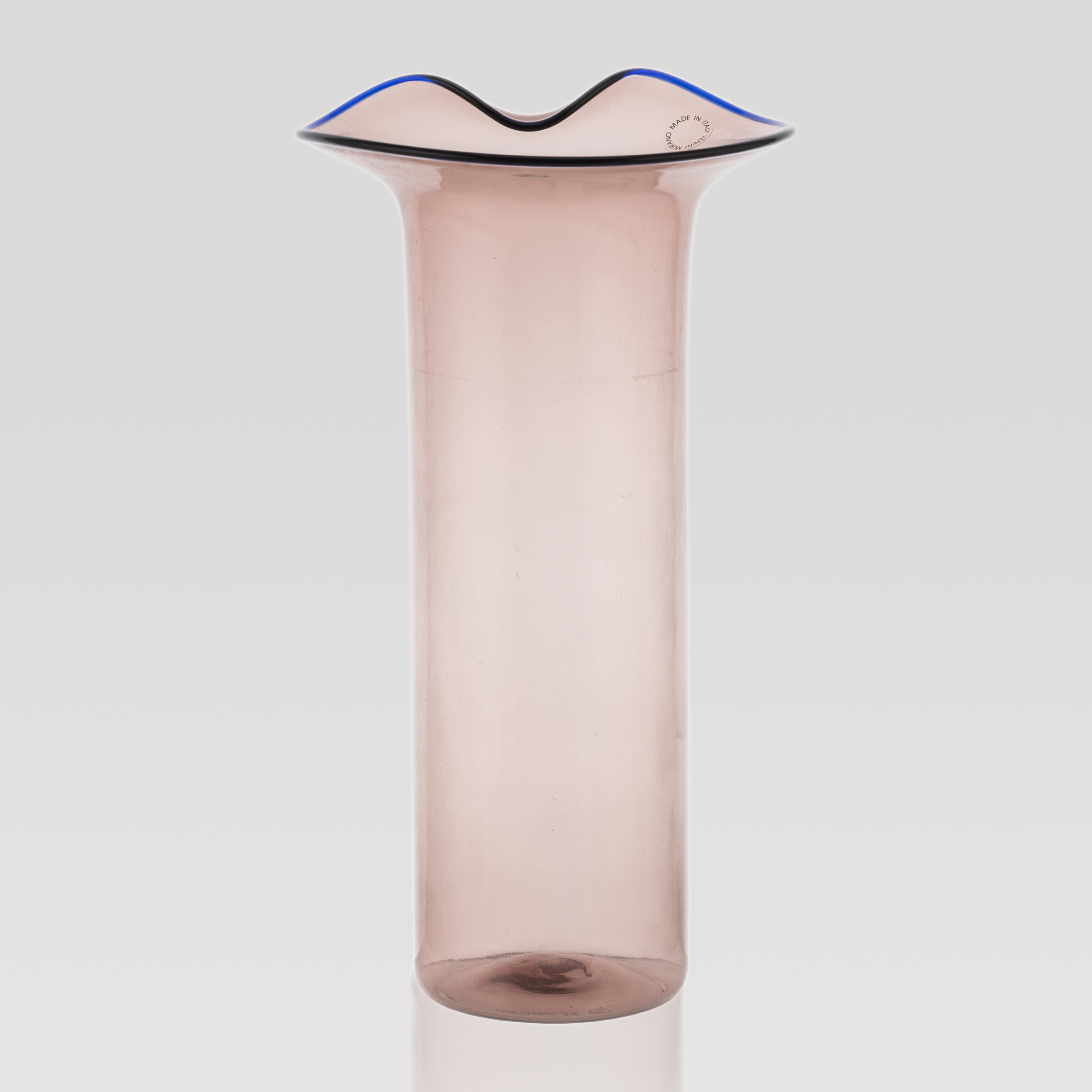 Murano, 1988 vaso mod. Svolazzi in vetro soffiato lilla e blu cobalto, firma a punta Venini '88, etichetta della produzione