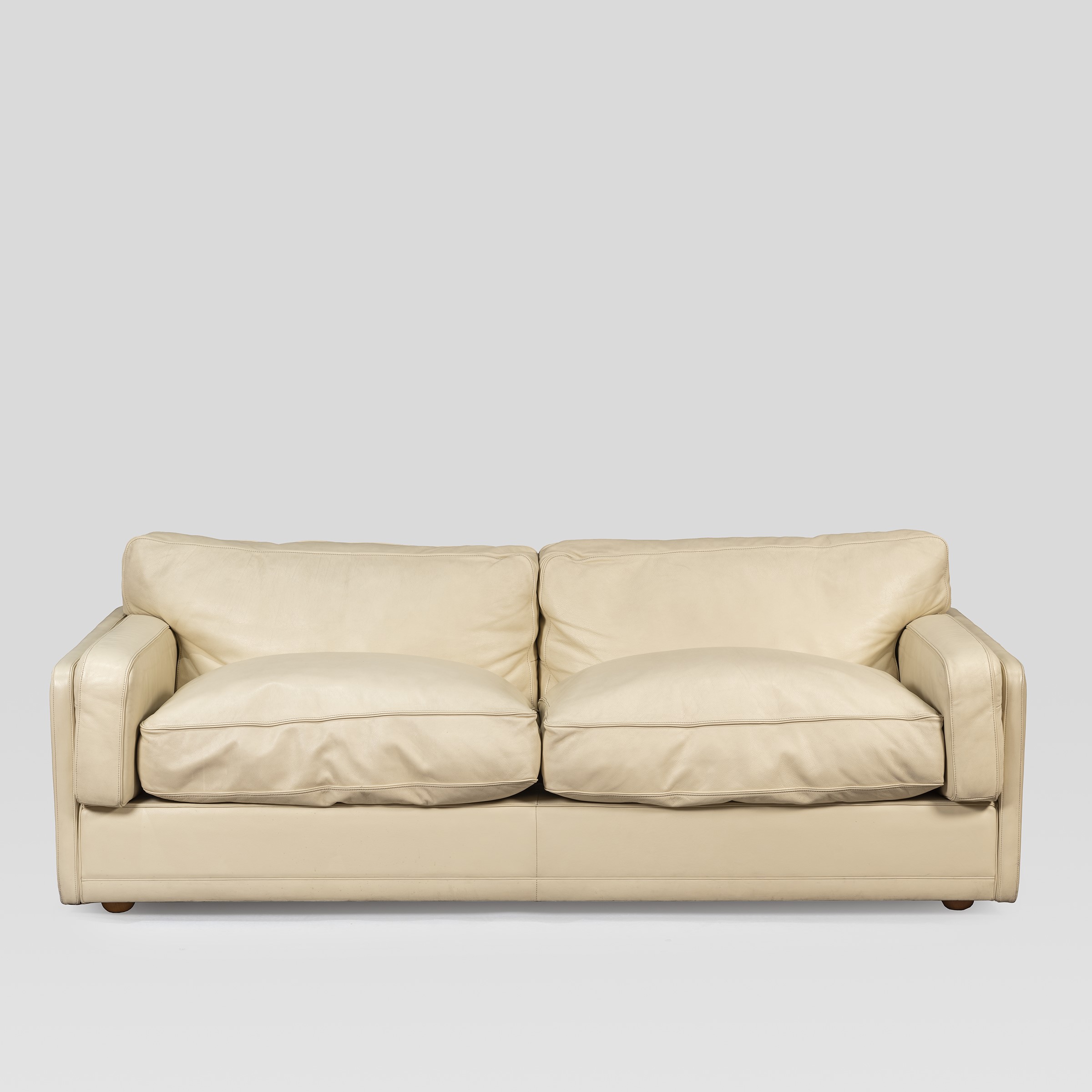 Italia, anni 80 divano mod. Socrate in legno e pelle imbottita, marchio della produzione, difetti