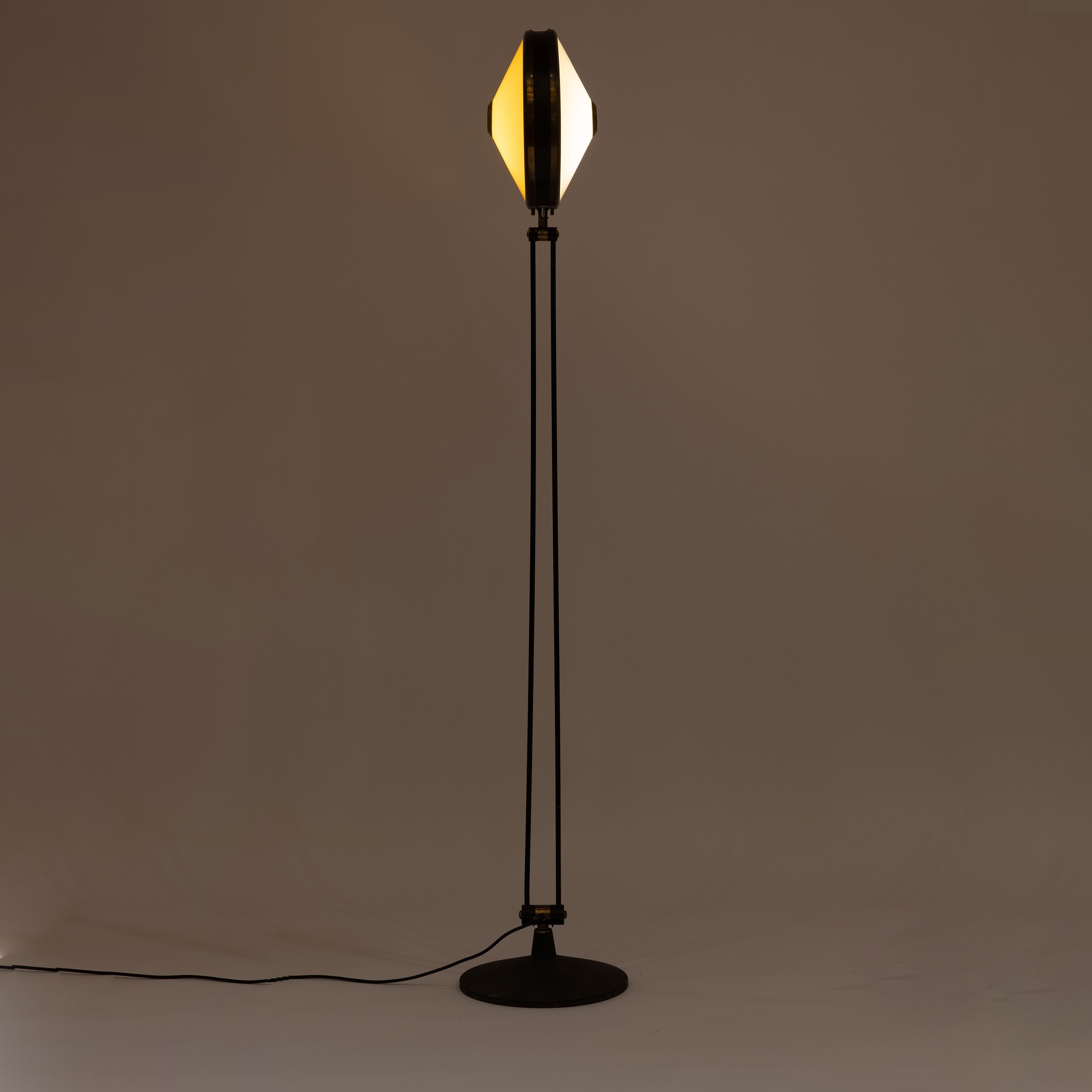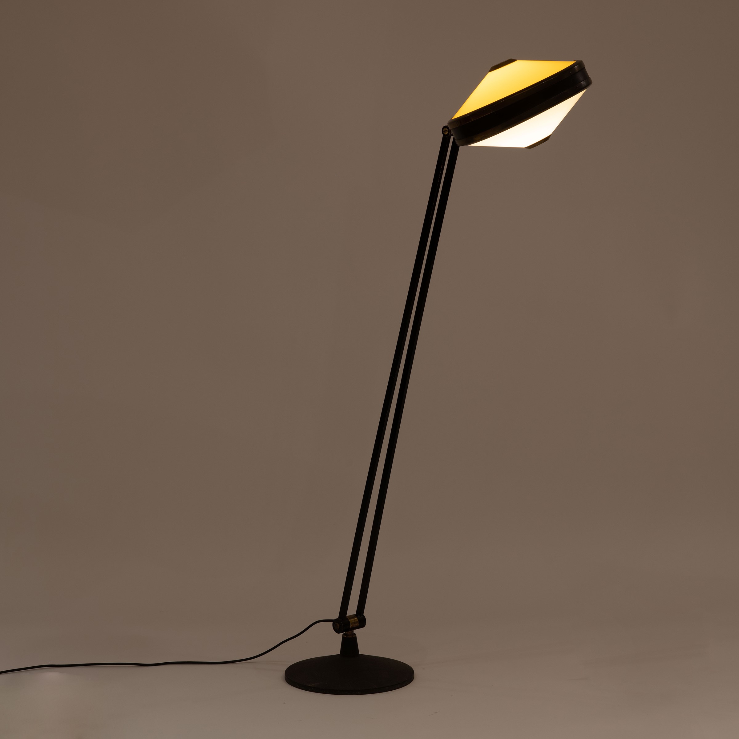 Italia, anni 60 lampada da terra mod. 4067 in ottone, metallo verniciato e perspex giallo e bianco, marchio del produttore