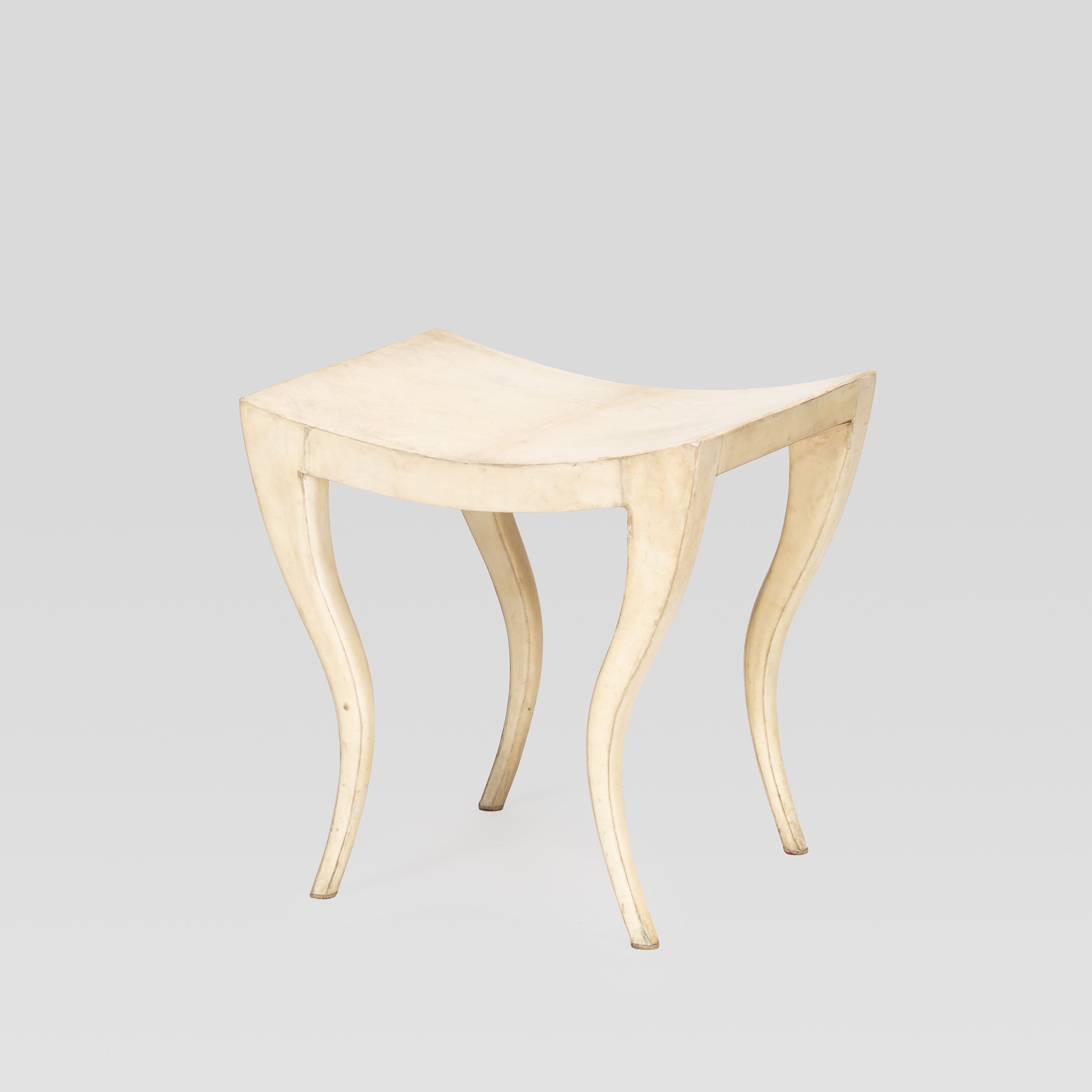 Parigi, anni 80 sgabello in legno e pergamena, etichetta della produzione