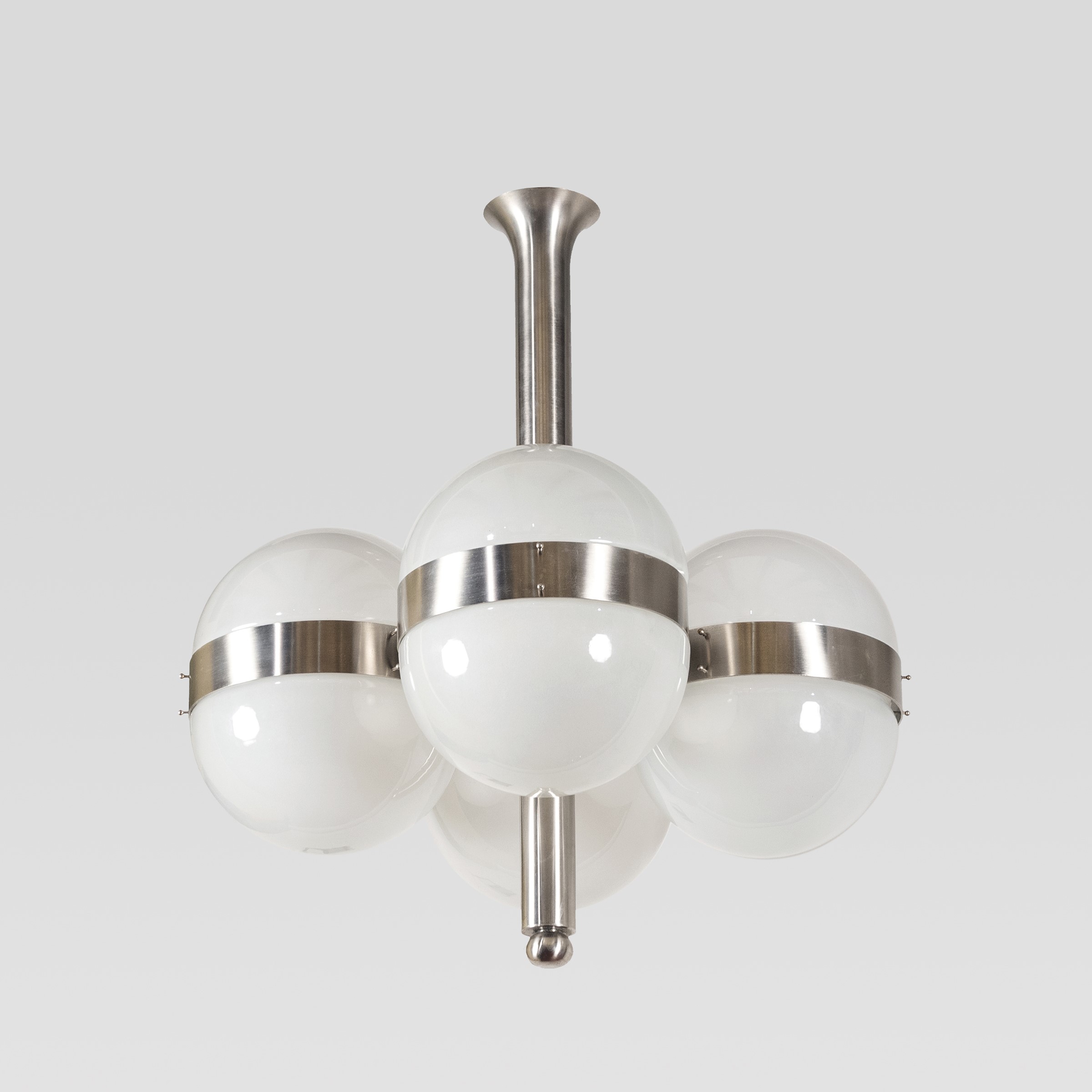 Italia, anni 60 lampada a sospensione mod. Tetraclio in ottone nichelato e vetro stampato