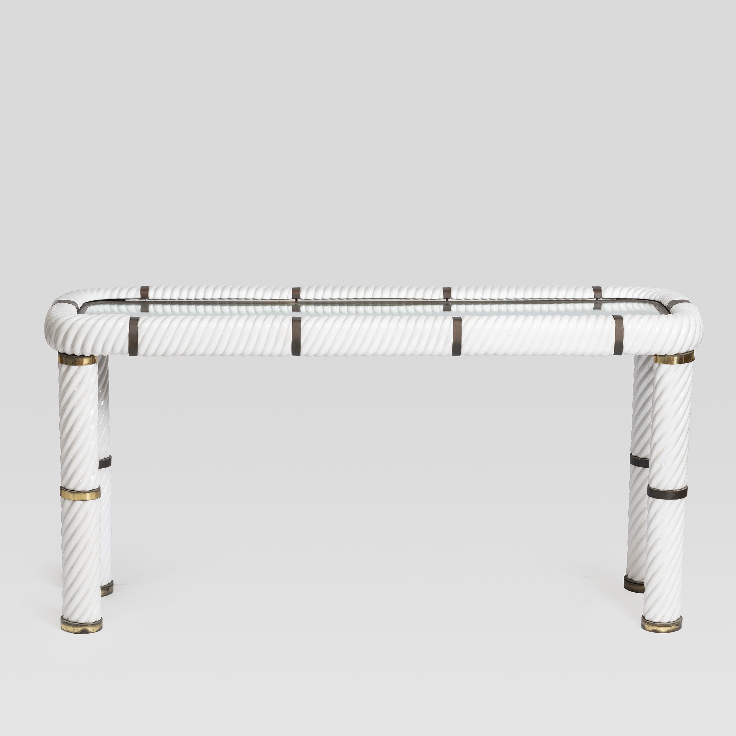 Italia, anni 70 console in ceramica, ottone e vetro specchiato, etichetta della produzione