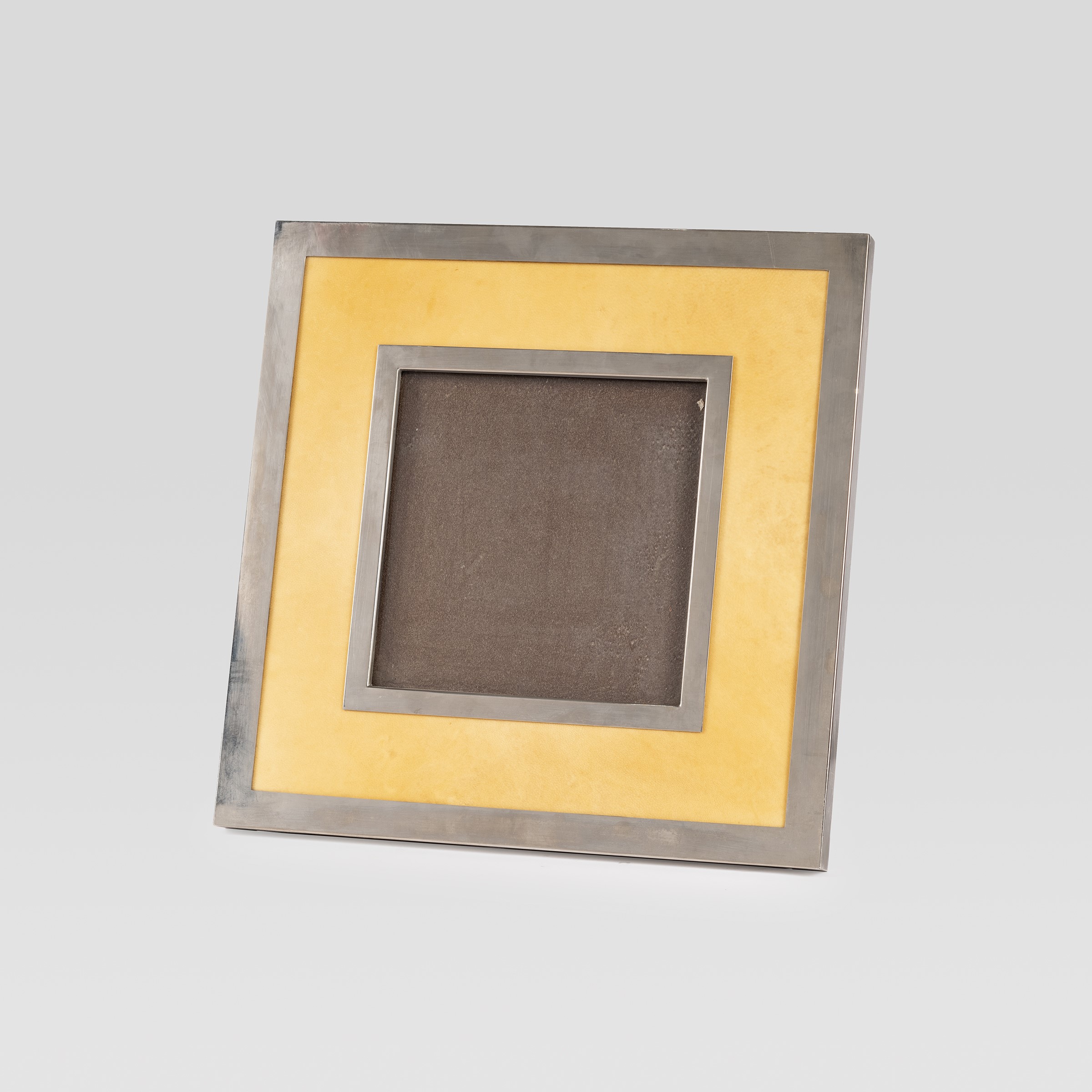 Italia, anni 70 cornice portafoto in metallo e resina, etichetta della produzione