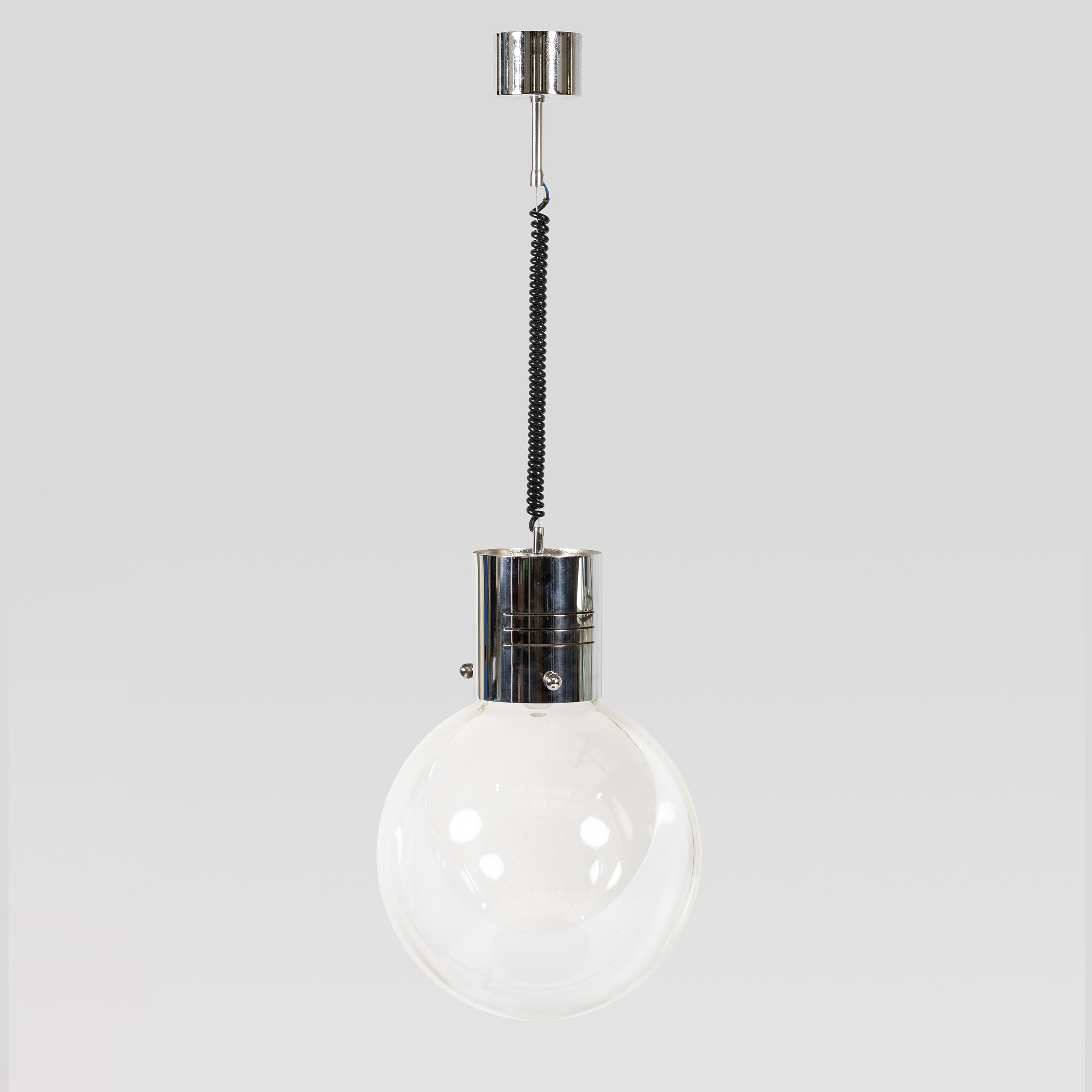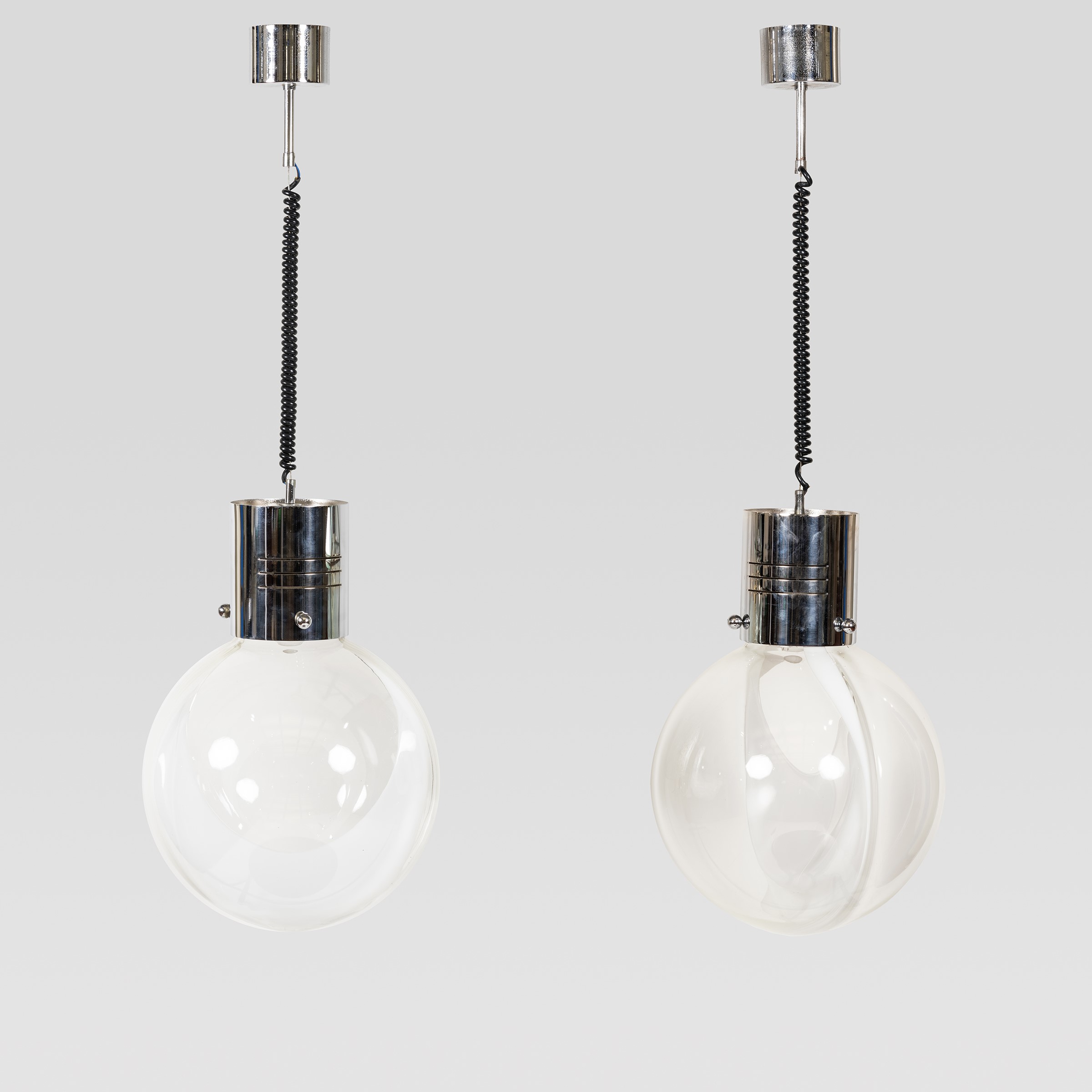 Murano, anni 70 coppia di lampade a sospensione mod. Membrane in metallo cromato e vetro soffiato