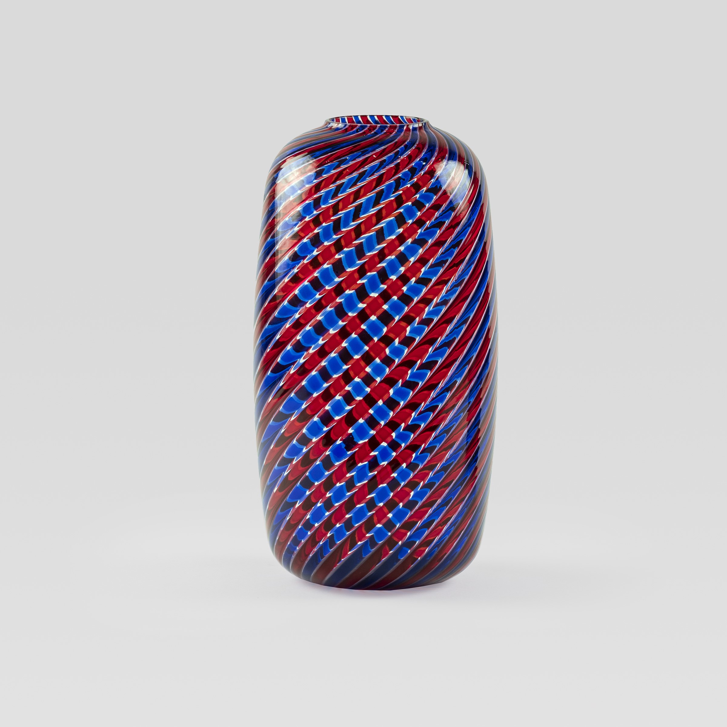 Murano, 1985 vaso in vetro soffiato a canne ritorte rosse e blu, firma a punta Venini Italia 1985, etichetta della produzione