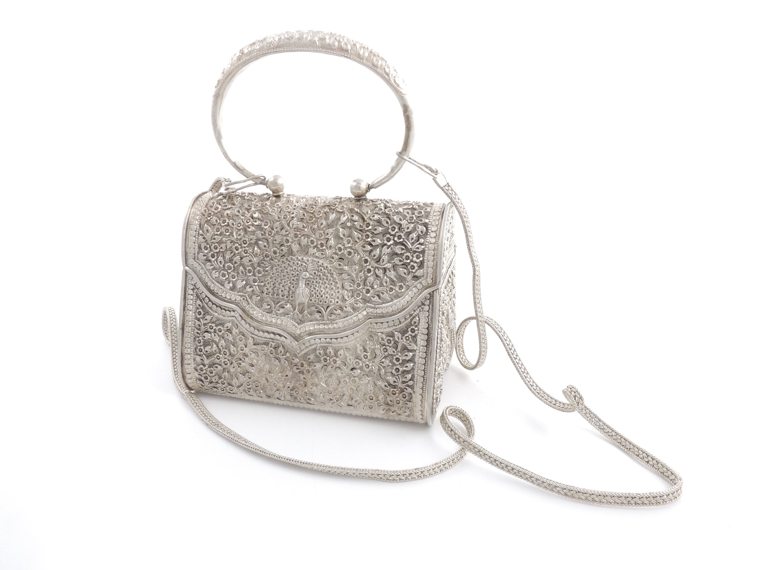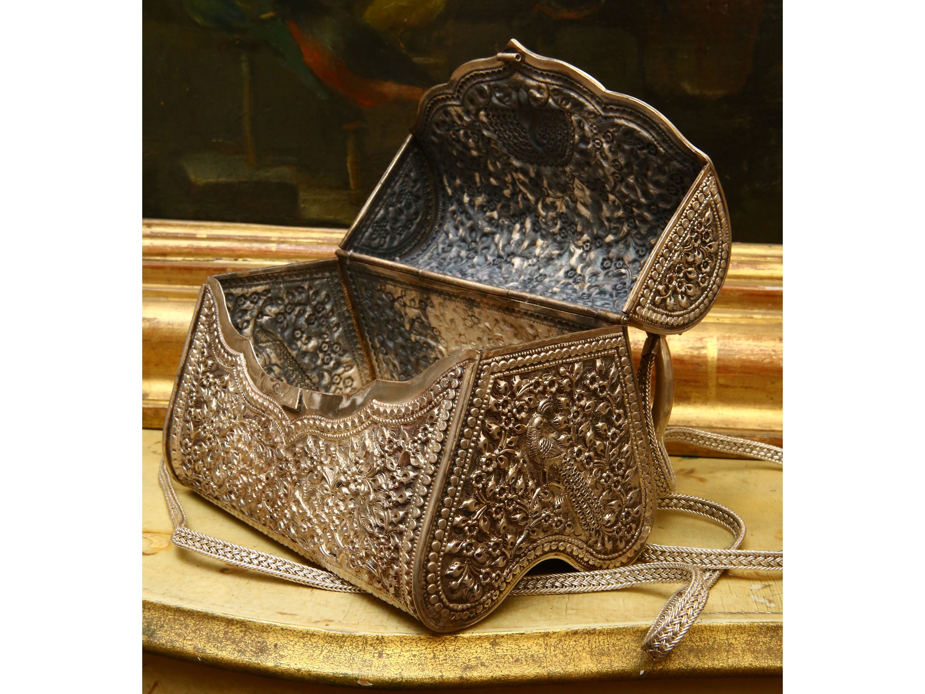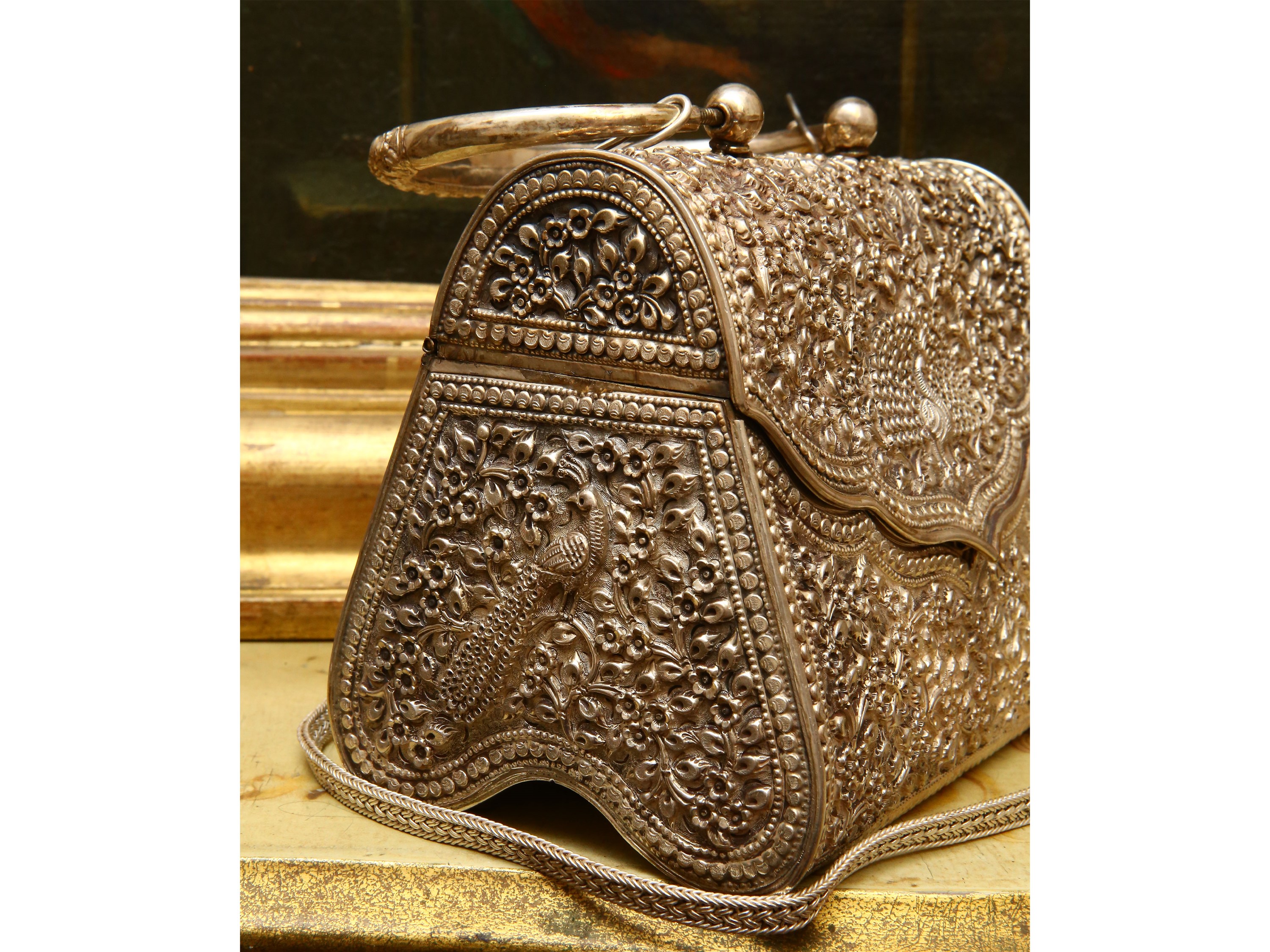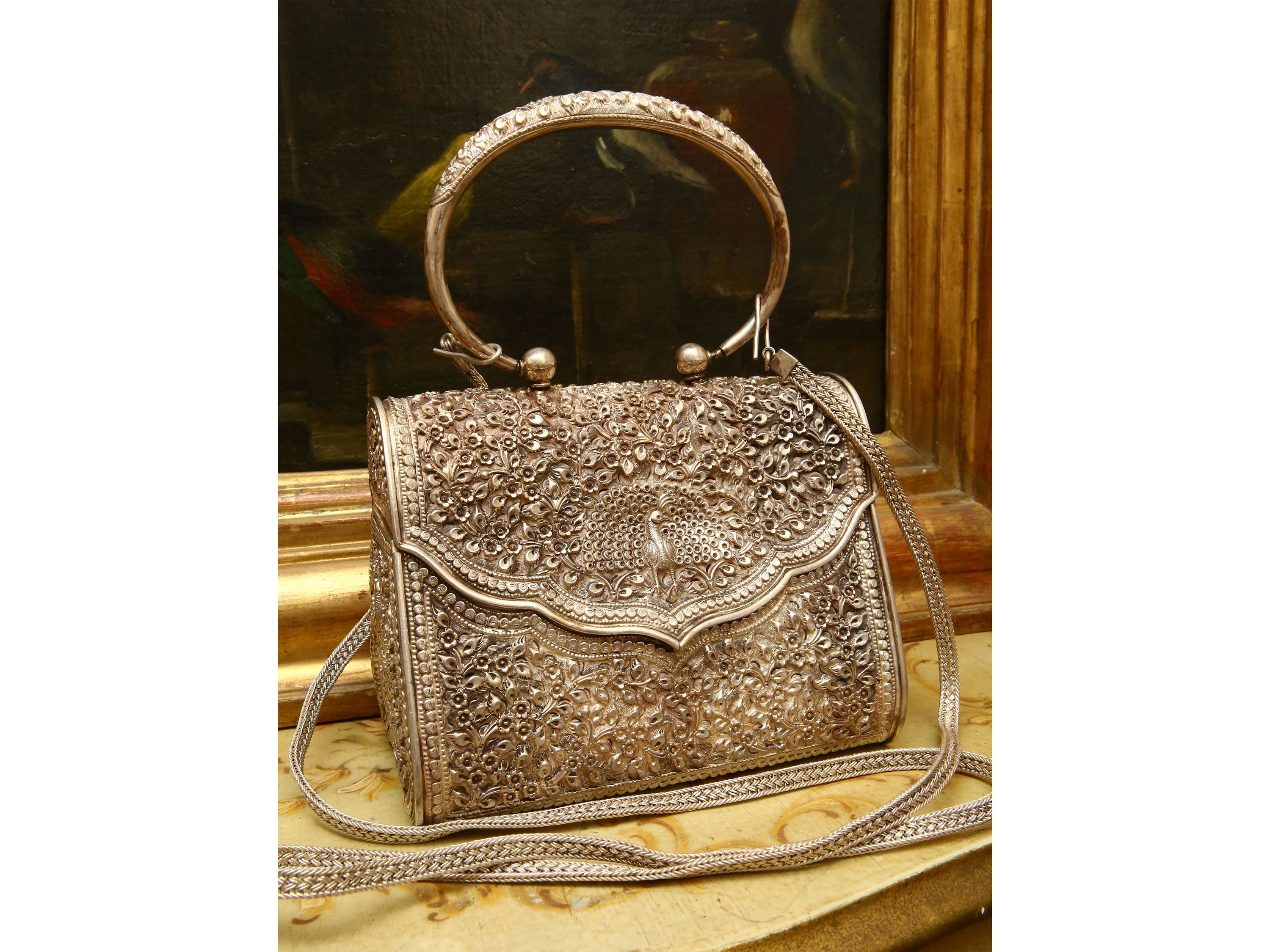 India, XX secolo interamente sbalzata con motivi floreali e vegetali, patta centrata da pavone, manico a cerchio, corredata da tracolla
