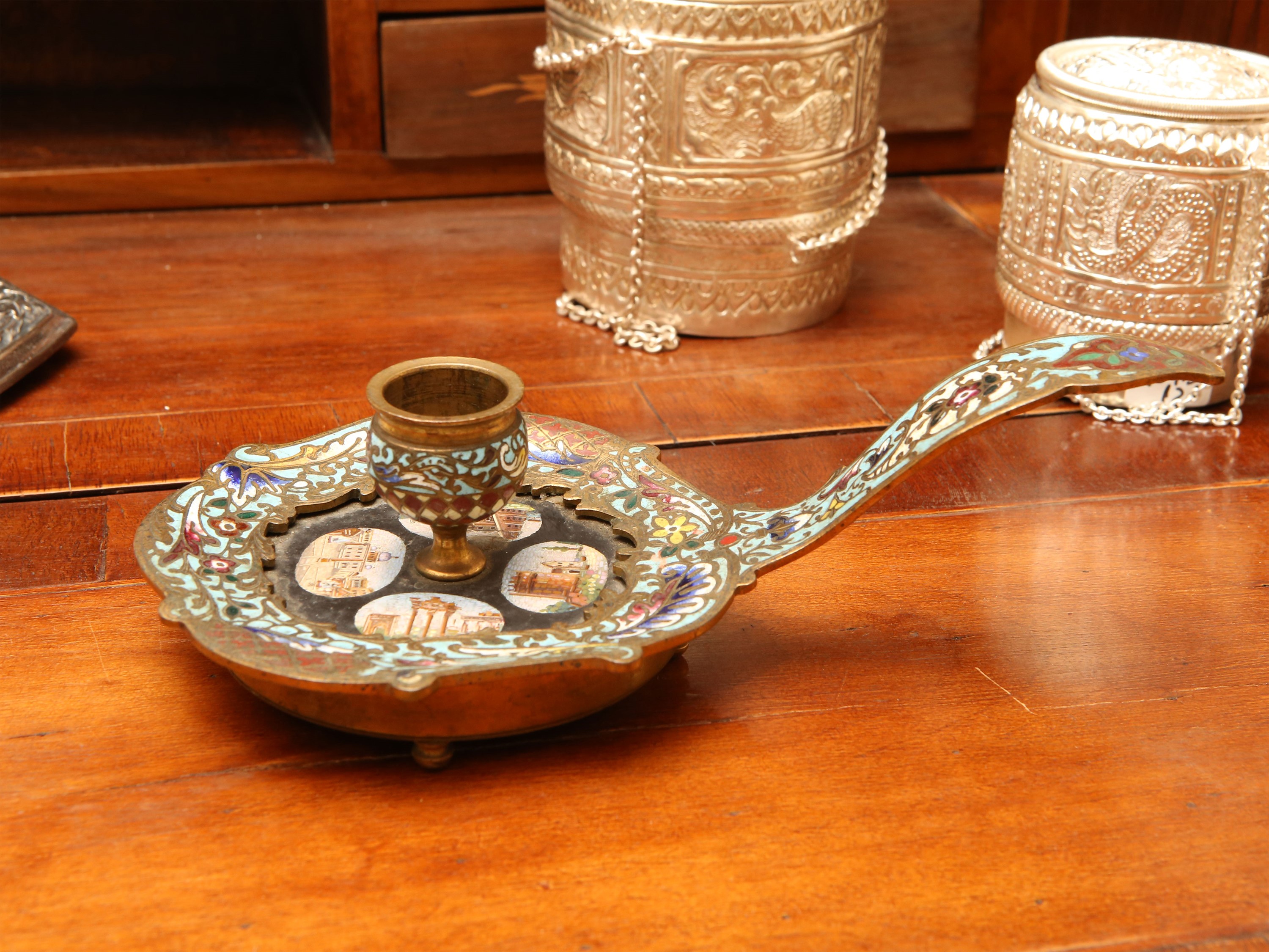 inizio del XX secolo realizzata come una piccola palmatoria impreziosita da placca recante quattro medaglioni ovali raffiguranti vedute di Roma