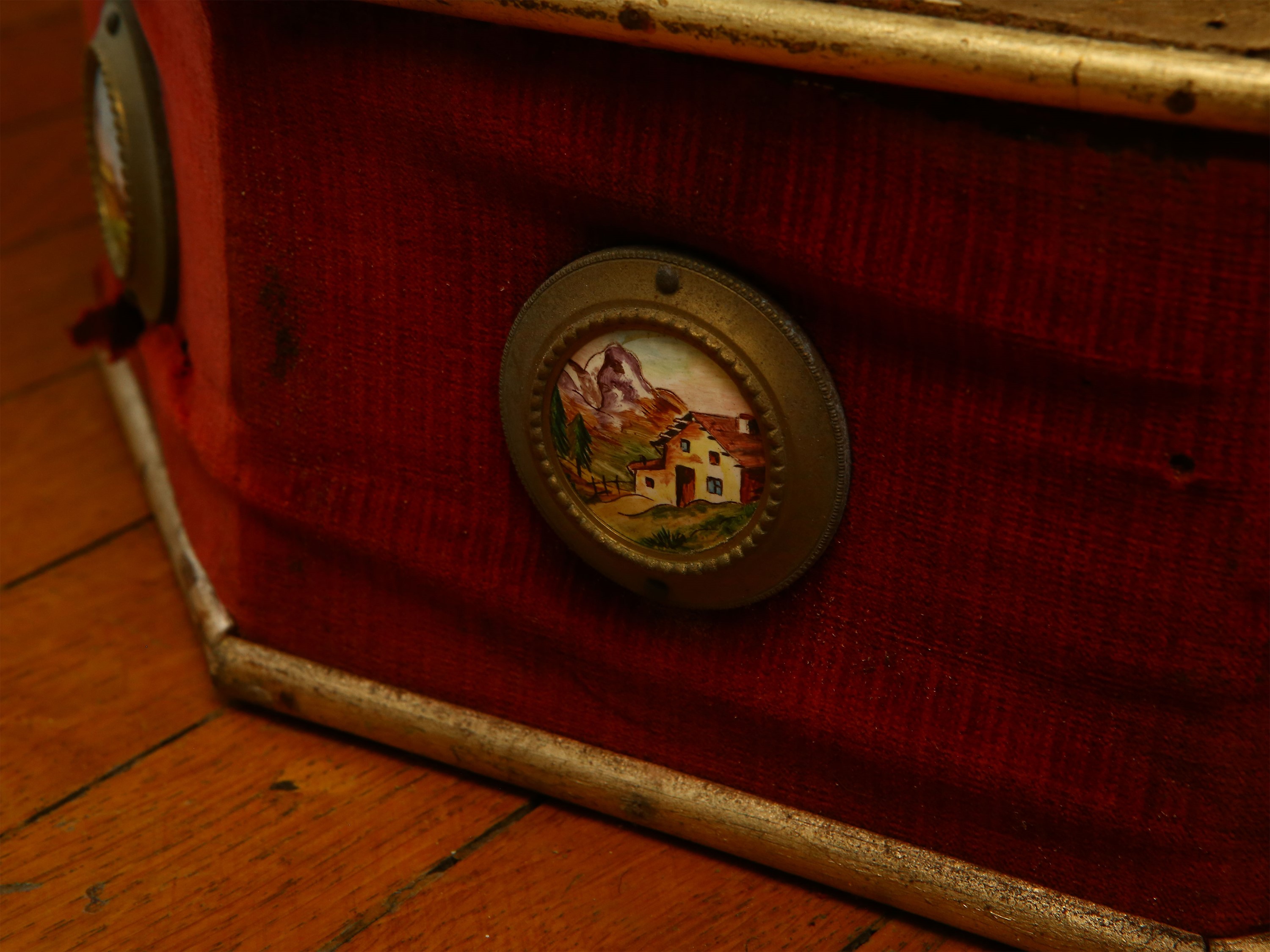 fine del XIX secolo parzialmente rivestita in velluto porpora, fusto scanalato su piede ottagonale impreziosito da otto cammei circolari in smalti, dipinti con paesaggi e vedute, alcuni difetti e mancanze