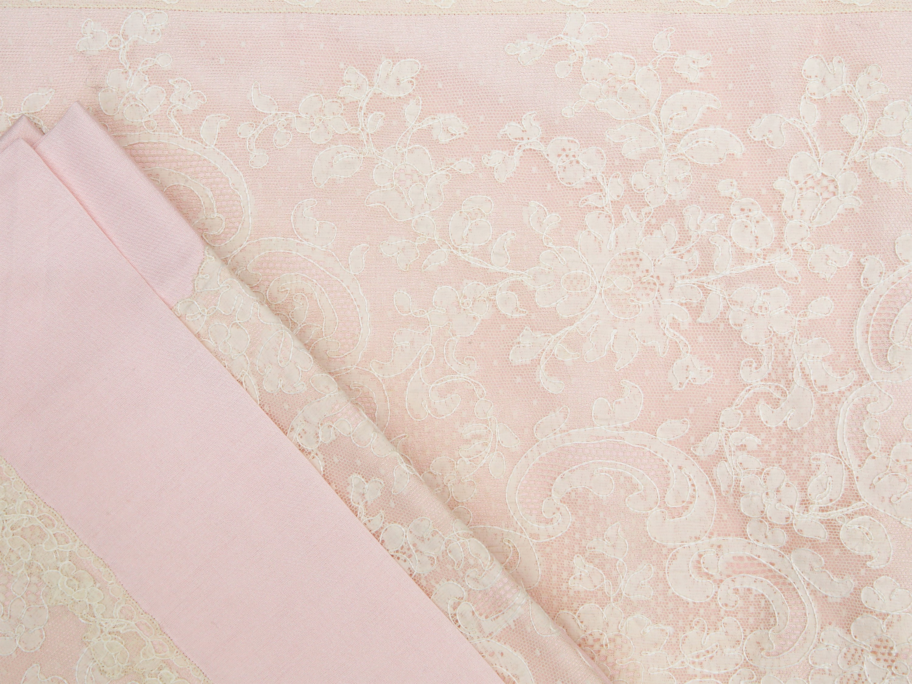 Completo matrimoniale in pura seta rosa e pizzo, artigianato fiorentino