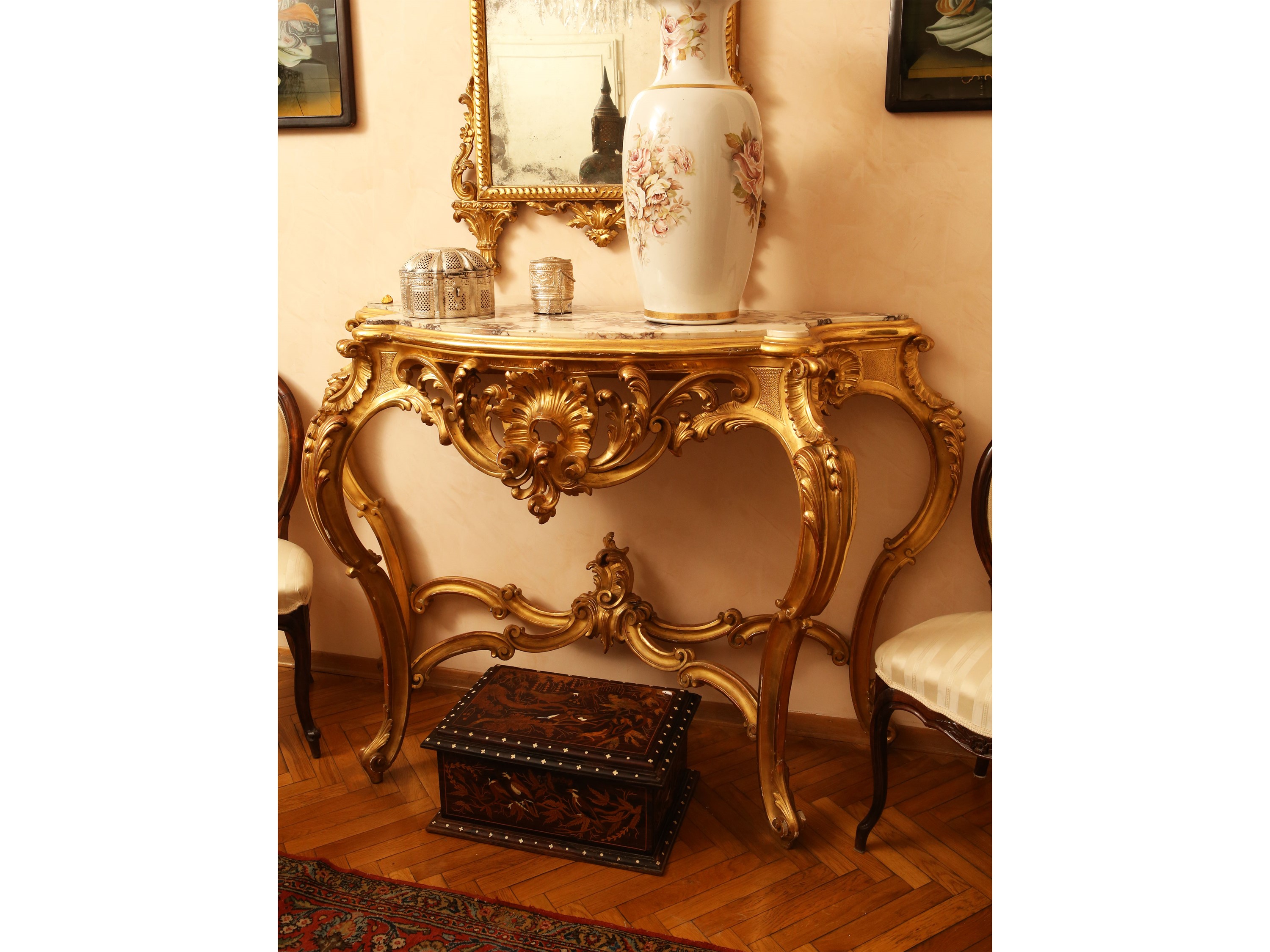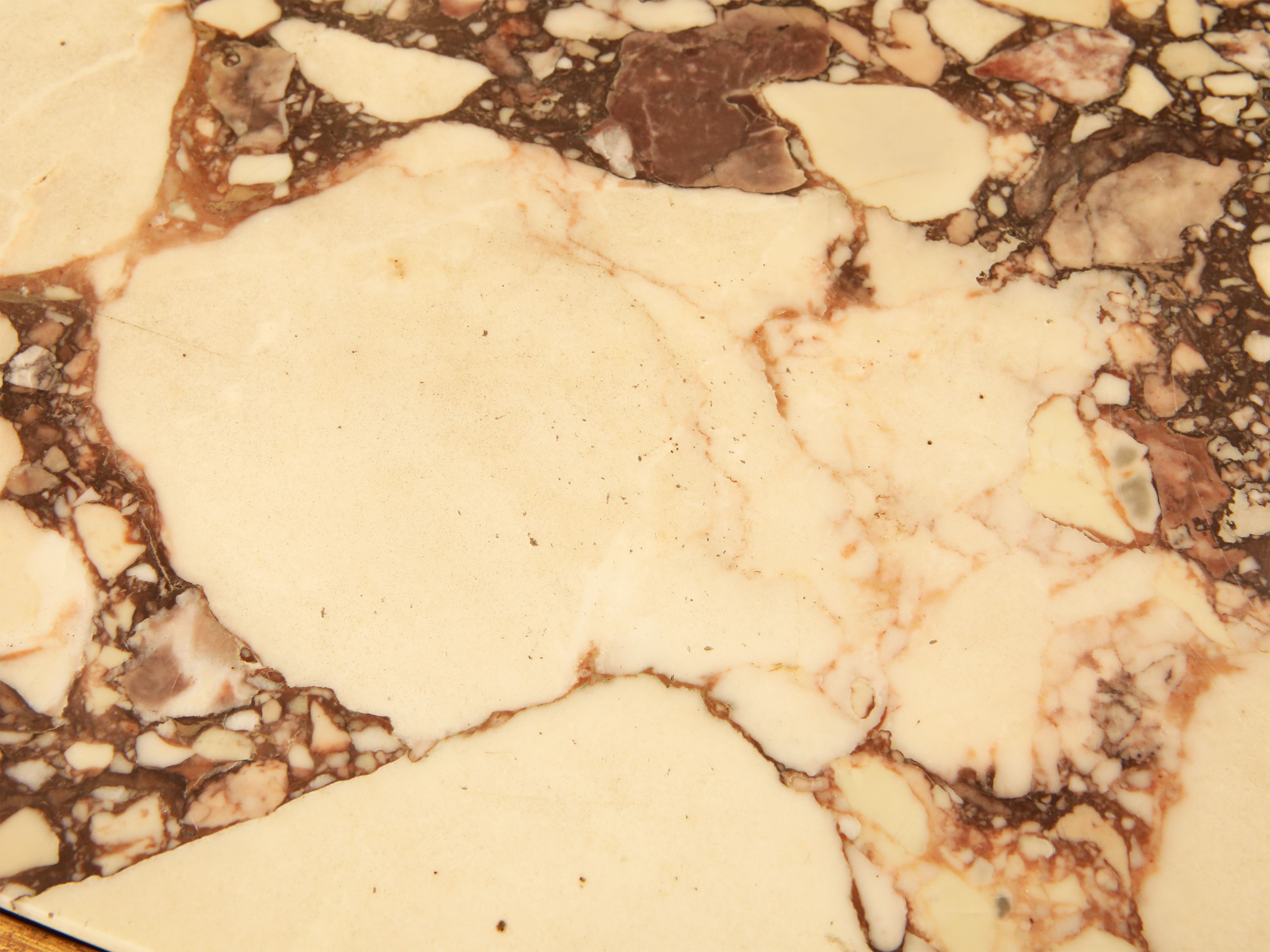 h cm 105x160x55 Toscana, metà del XIX secolo piano sagomato in marmo, pendaglina finemente intagliata a volute centrate da motivo a conchiglia, gambe a doppia voluta riunite da quattro traverse mosse centrate da dettaglio a rocaille e foglie d'acanto, alcuni difetti
