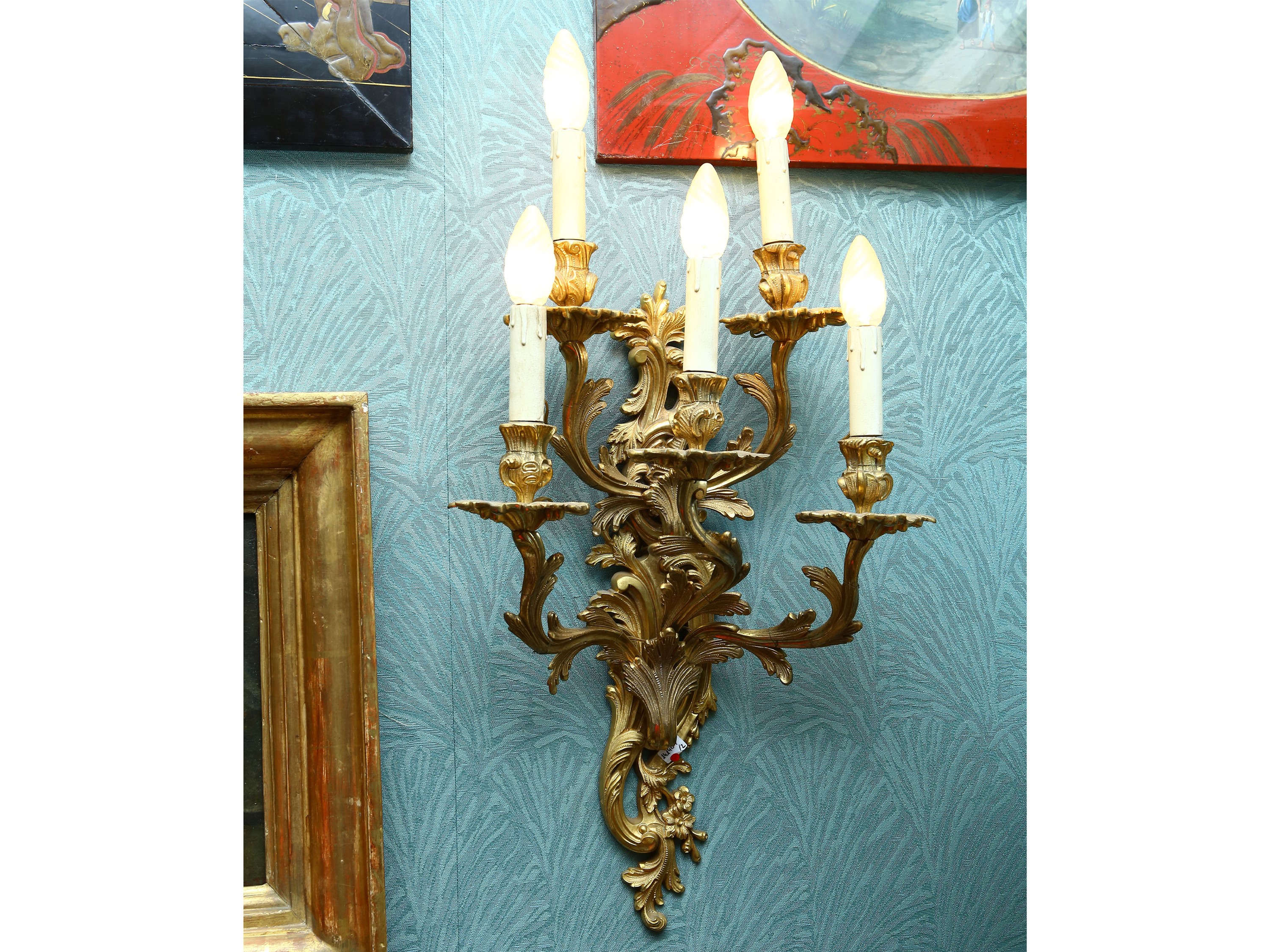 realizzate in stile Rococò, sbalzate con trionfo di foglie d'acanto e piccoli fiori, cinque bracci portacandele