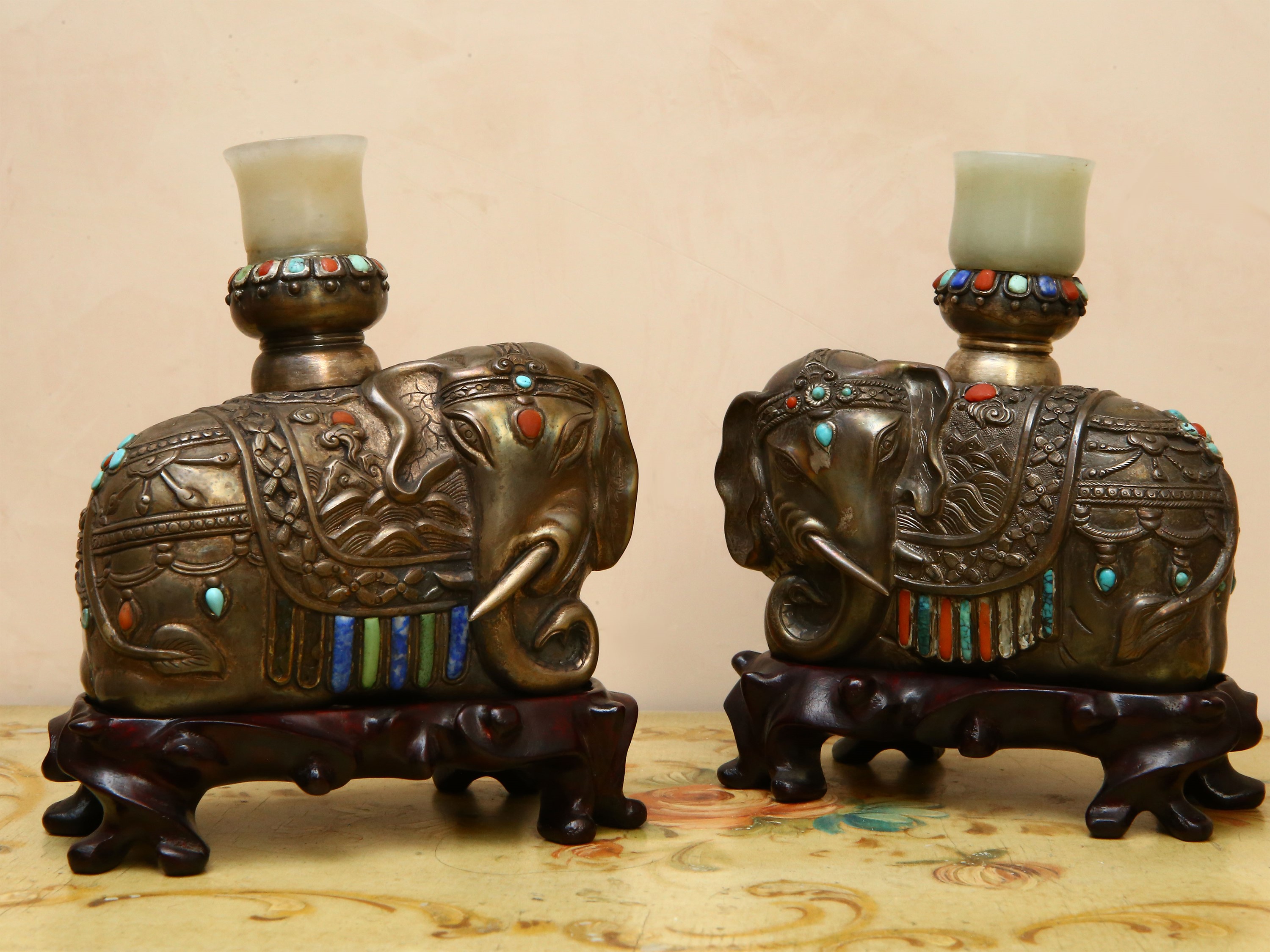 Arte asiatica, XX secolo realizzati come due elefanti accucciati, impreziositi da pietre dure, bobeche in giadeite, su basi in tek, alcune mancanze