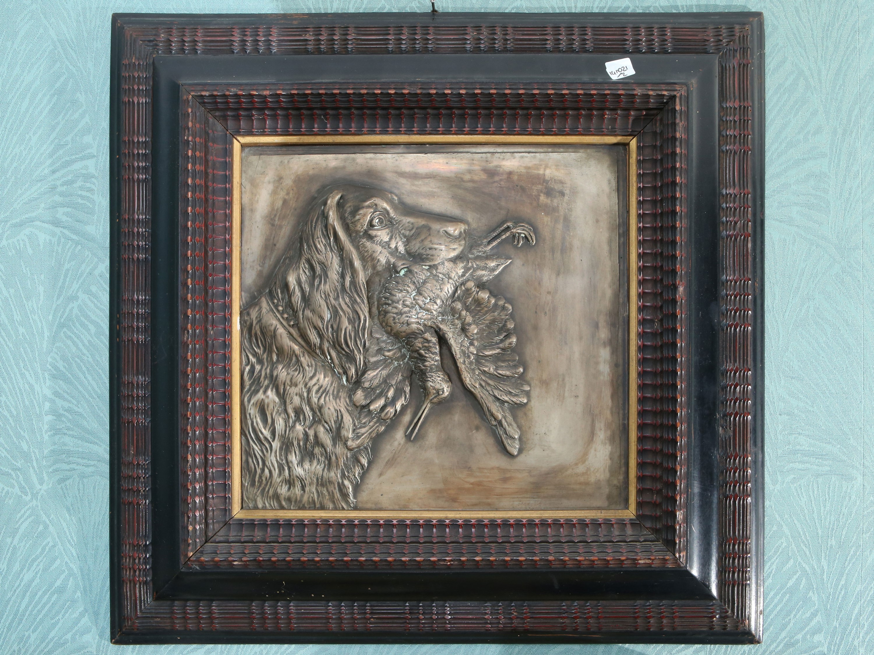 inizio del XX secolo realizzati ad altorilievo con soggetti di caccia raffiguranti cani con fagiano e beccaccia, entro cornici coeve in legno ebanizzato