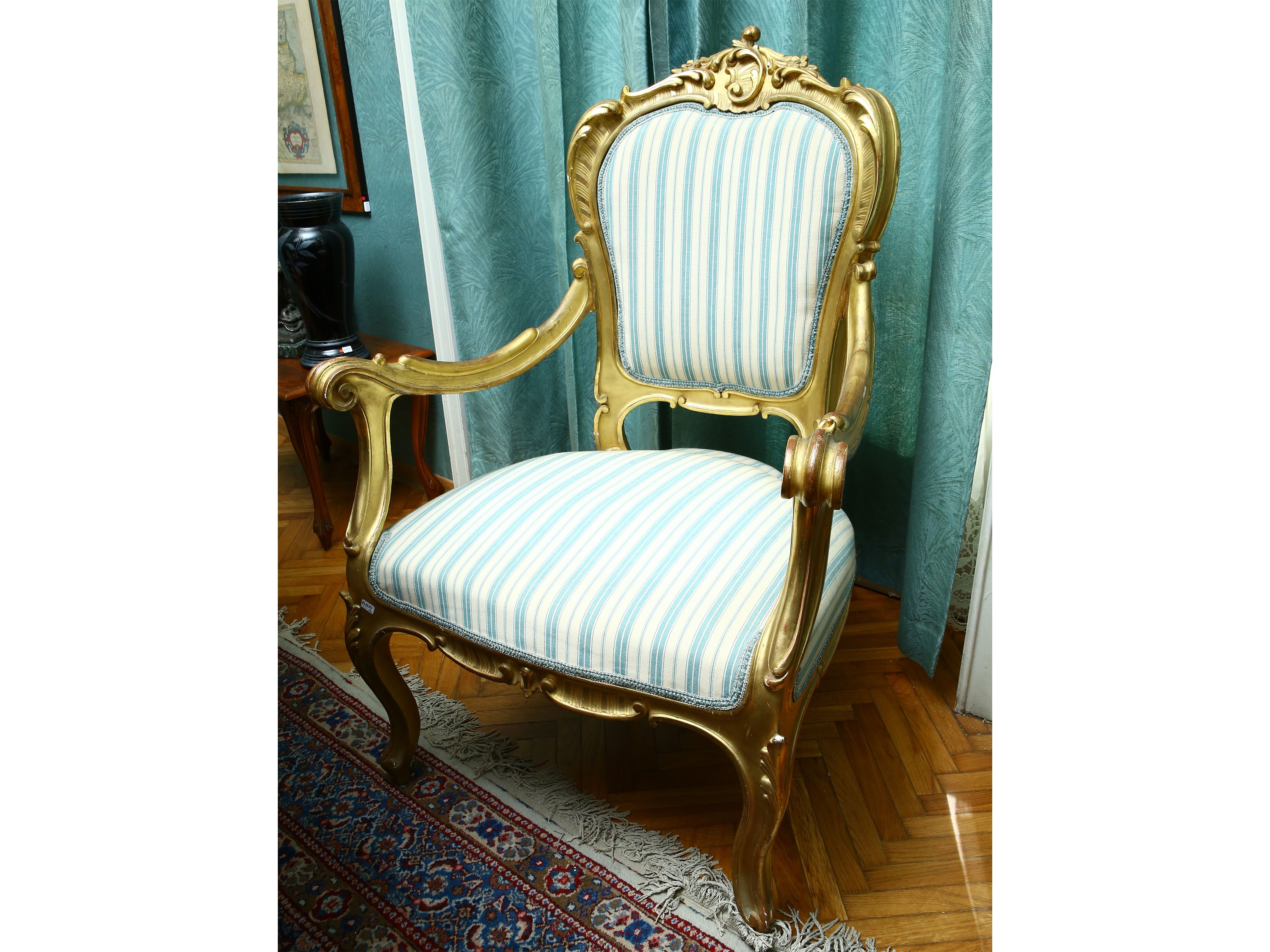 Toscana, metà del XIX secolo schienali sagomati intagliate con motivi vegetali e centrati da rocaille, braccioli a giorno desinenti a ricciolo, gambe anteriori mosse con piedini a ricciolo, imbottite e rivestite in tessuto rigato nei toni del celeste, lievi mancanze alla doratura