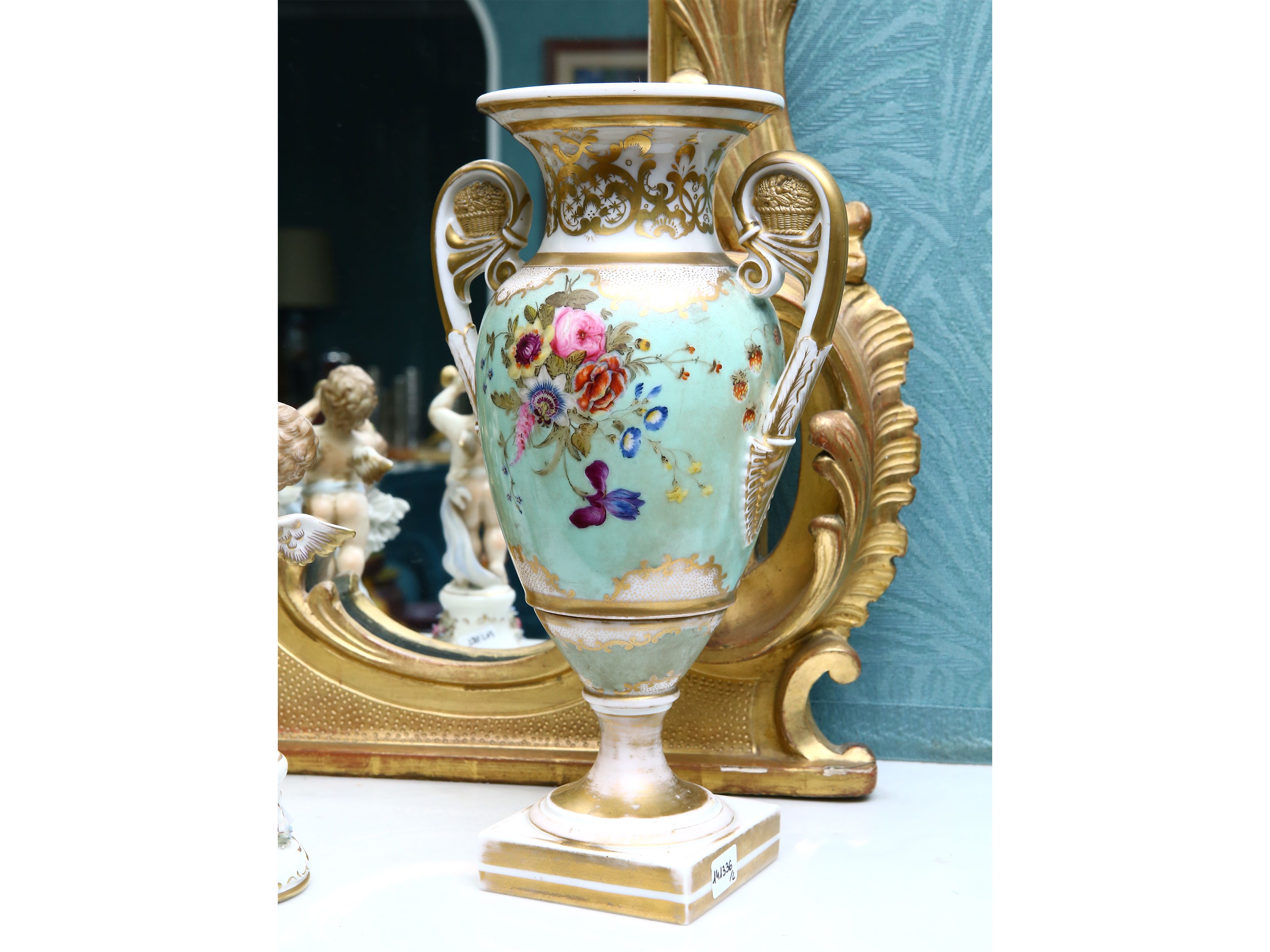 h cm 30 Francia, prima metà del XIX secolo realizzati a balaustro, due anse a voluta con finali a medaglione, dipinti con mazzi di fiori policromi su fondo celeste, su piedi a plinto, lievi difetti alla doratura