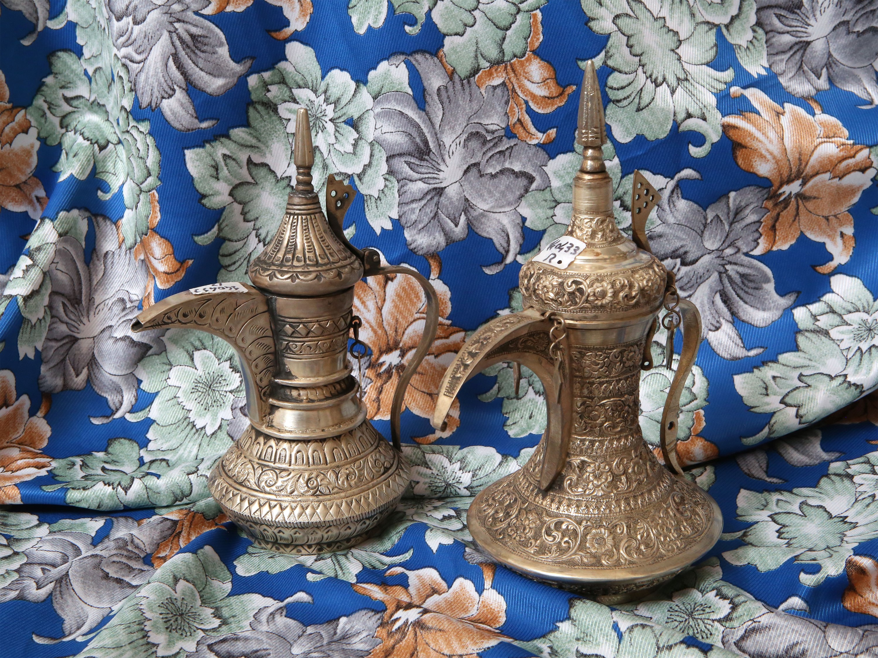 Asia realizzate in stile Dallah, interamente istoriate, una con motivi floreali e volute e l'altra geometrici, coperchi a pinnacolo e beccucci ricurvi