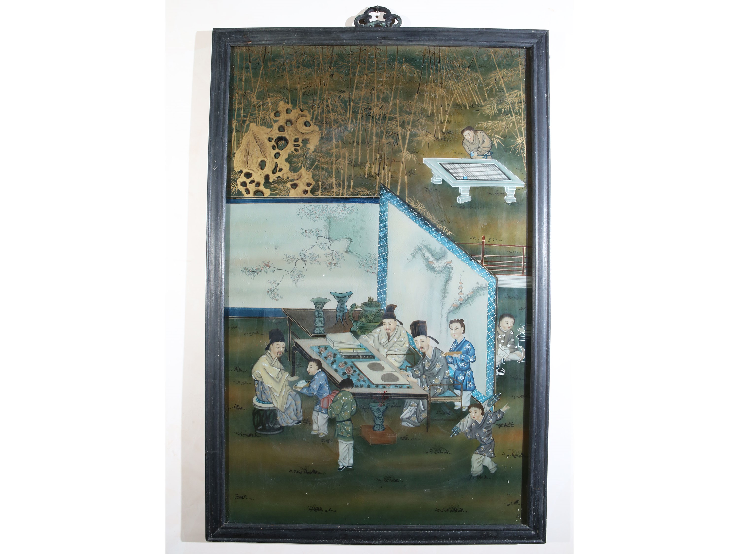 Cina, inizio del XX secolo raffiguranti scene di corte con lumeggiature dorate, nelle loro cornici originali in legno ebanizzato