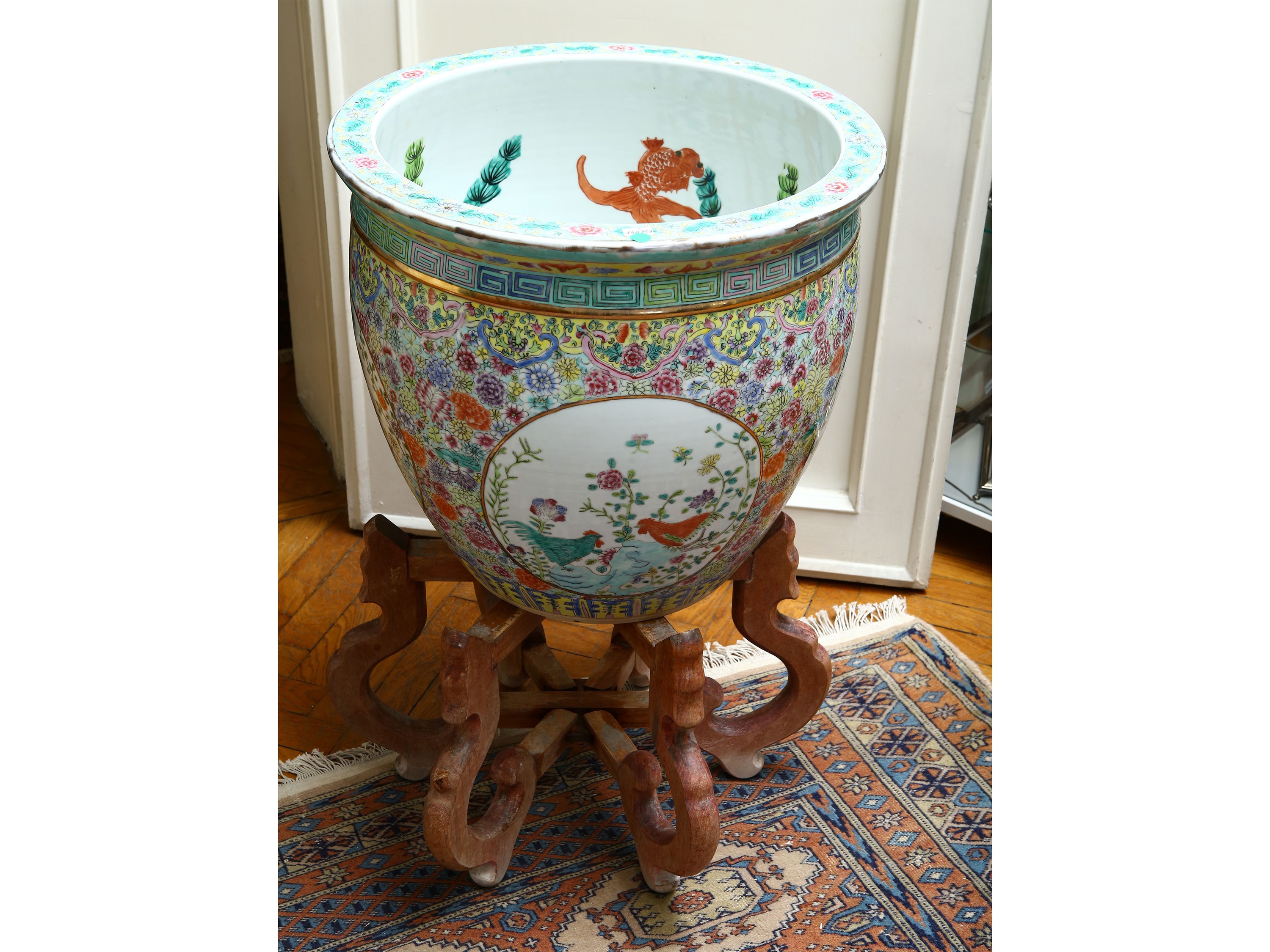 Cina, XX secolo dipinto con galli e fagiani entro riserve lumeggiate in oro su fondo floreale policromo, base in tek