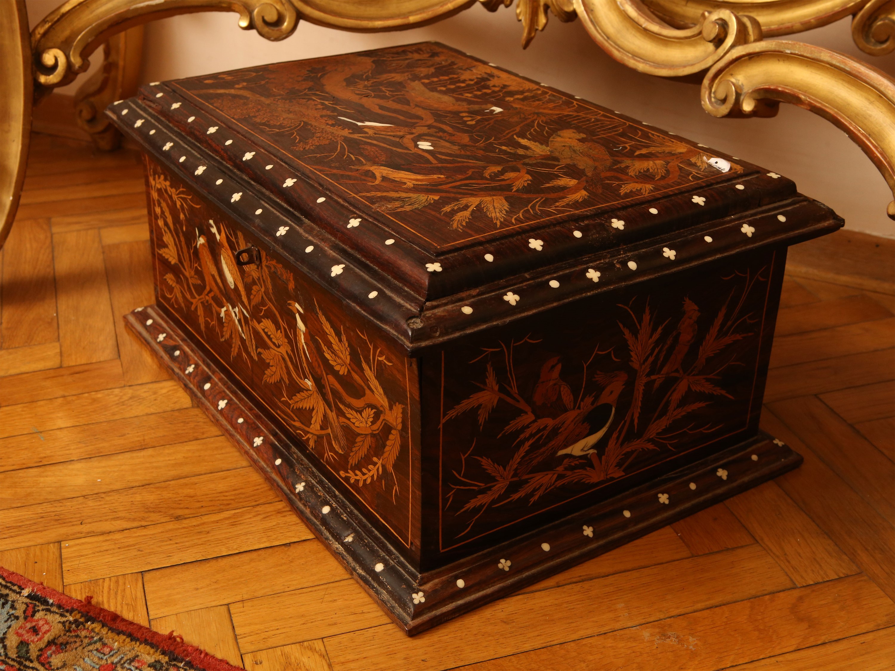 Nord Europa, seconda metà del XIX secolo intarsiato in varie essenze con motivo di racemi, fiori e volatili, all'interno specchio, rivestito in velluto rosso, alcuni difetti
