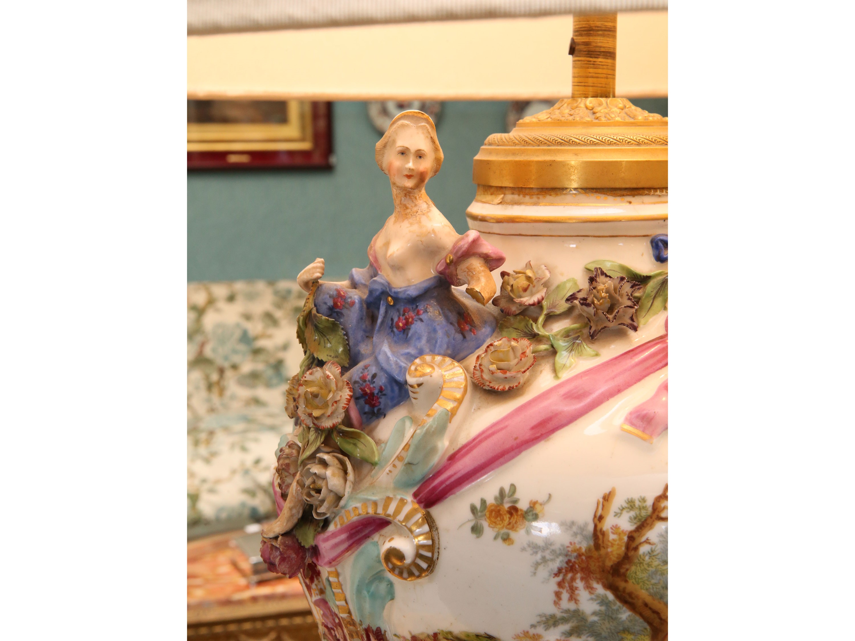 inizio del XX secolo a balaustro, interamente dipinto con scene galati policrome in stile settecentesco, due prese realizzate come figure femminili, rilegato in metallo dorato e montato a lume, corredato di paralume, restauri