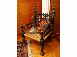 Asia schienale e braccioli decorati con campanelli variopinti, sedile incannucciato