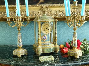 candelabri h cm 45, orologio h cm 43 (3) Francia, inizio del XX secolo composto da orologio e coppia di candelabri, [..]