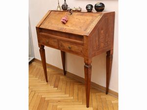 Piccola scrivania a ribalta imiallacciata in noce e altre essenze