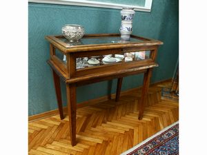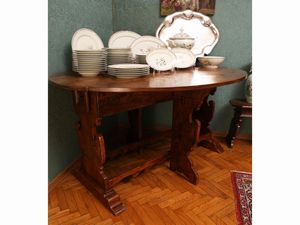 h cm ... piano sagomato in marmo, quattro sostegni a doppia mossa riuniti da motivo a sfera, alcuni restauri