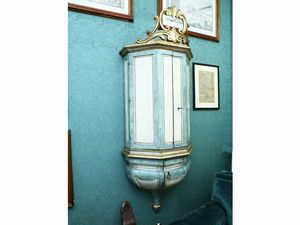 Stipo pensile in legno laccato nei toni del celeste e dell'avorio