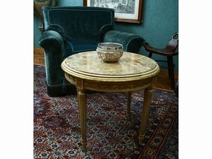 h cm 52, diam cm 54 piano di forma rotonda in marmo, fascia impreziosita da intarsio e nastro, gambe a faretra [..]