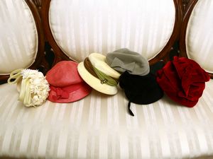 Anni Cinquanta di varie forme in velluto, panno e paglia, tra cui uno ornato da fiori e grande fiocco bianco [..]