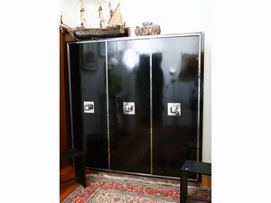 h cm 184x180x55 Anni Settanta in legno rivestito in laminato plastico nero, dettagli in metallo cromato