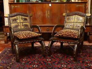 schienali rivestiti con placche di metallo con elefanti a bassorilievo, braccioli arcuati a giorno, applicazione [..]