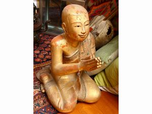 h cm 54 Arte asiatica raffigurante un monaco buddista in preghiera, impreziosito da inclusioni in vetro color [..]