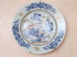 diam cm 23 Cina, fine del XIX secolo dipinti con motivi floreali e simboli in monocromia blu, la coppia con lumeggiature [..]