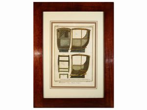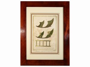foglio cm 42x27 XVIII secolo cinque incisioni con acquerellatura, in cornice, alcuni difetti