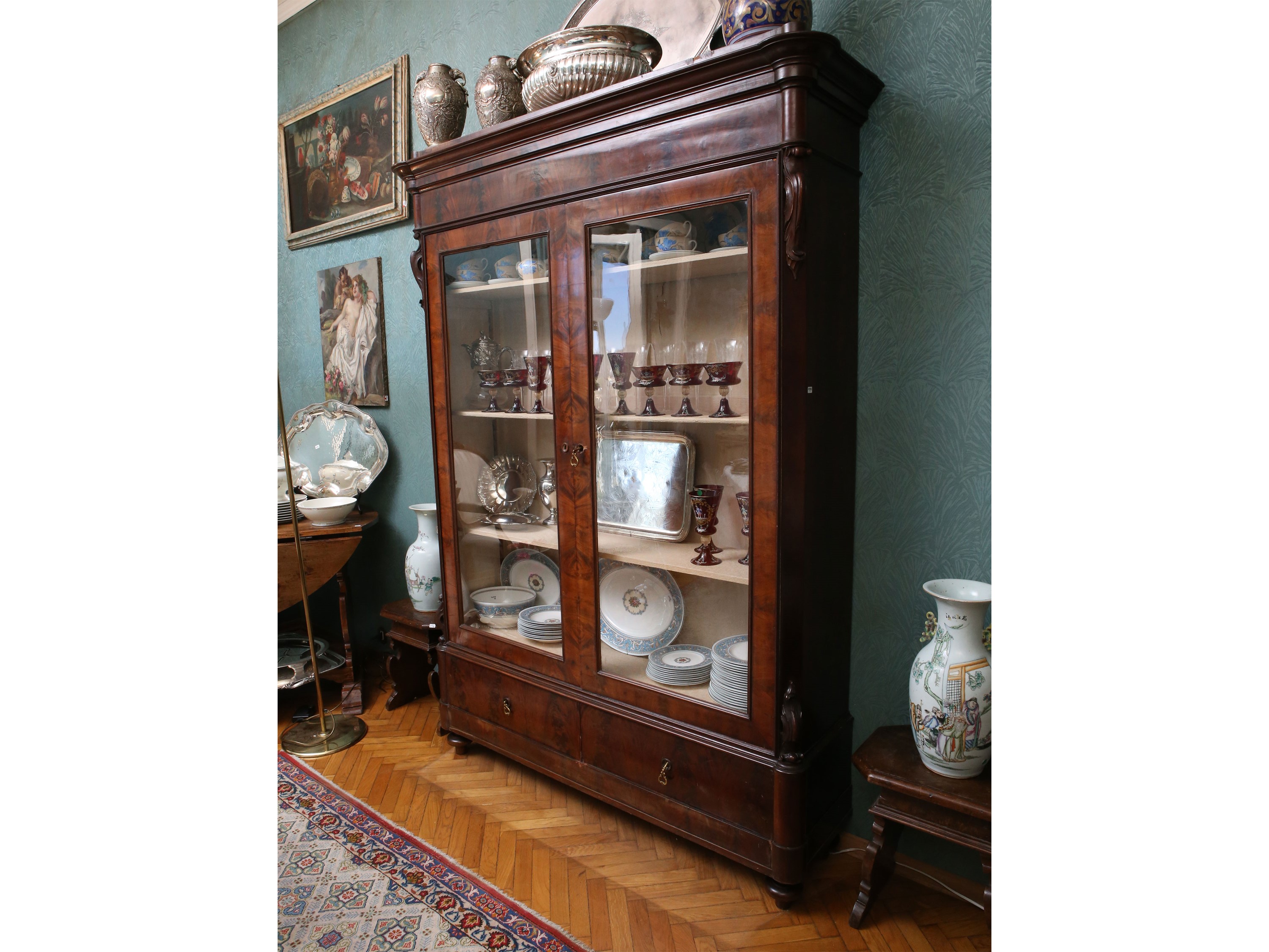 h cm 220x150x38 seconda metà del XIX secolo cappello aggettante con fascia modanata, due sportelli a vetro sul fronte dritto tra lesene scantonate con finali desinenti a volute, due cassetti alla base, piedi a trottola