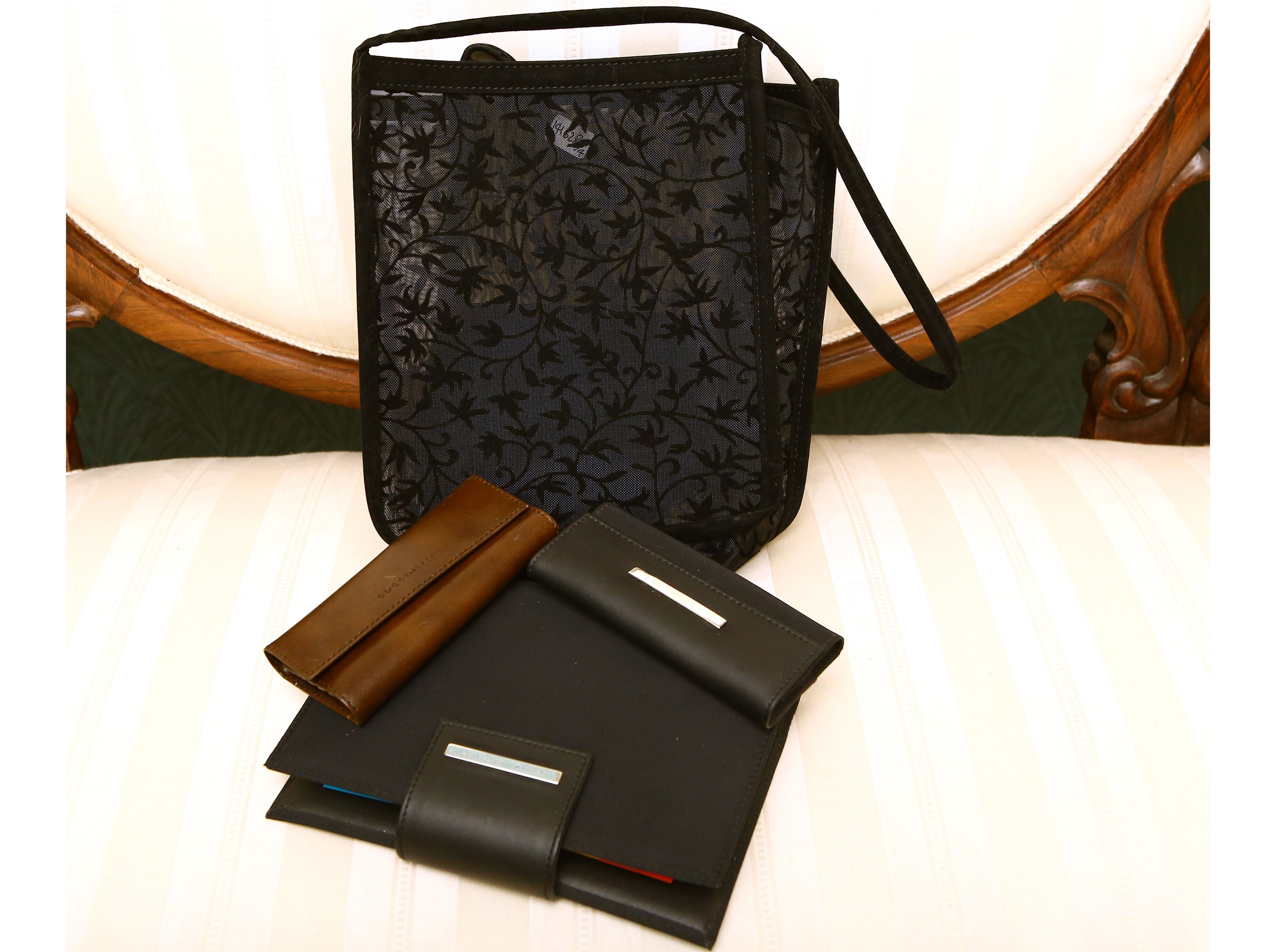 composto da una borsa in nylon ornata con foglioline e manici in alcantara nera, due portachiavi in pelle marrone e tessuto nero ed una agenda in tessuto tecnico nero, difetti