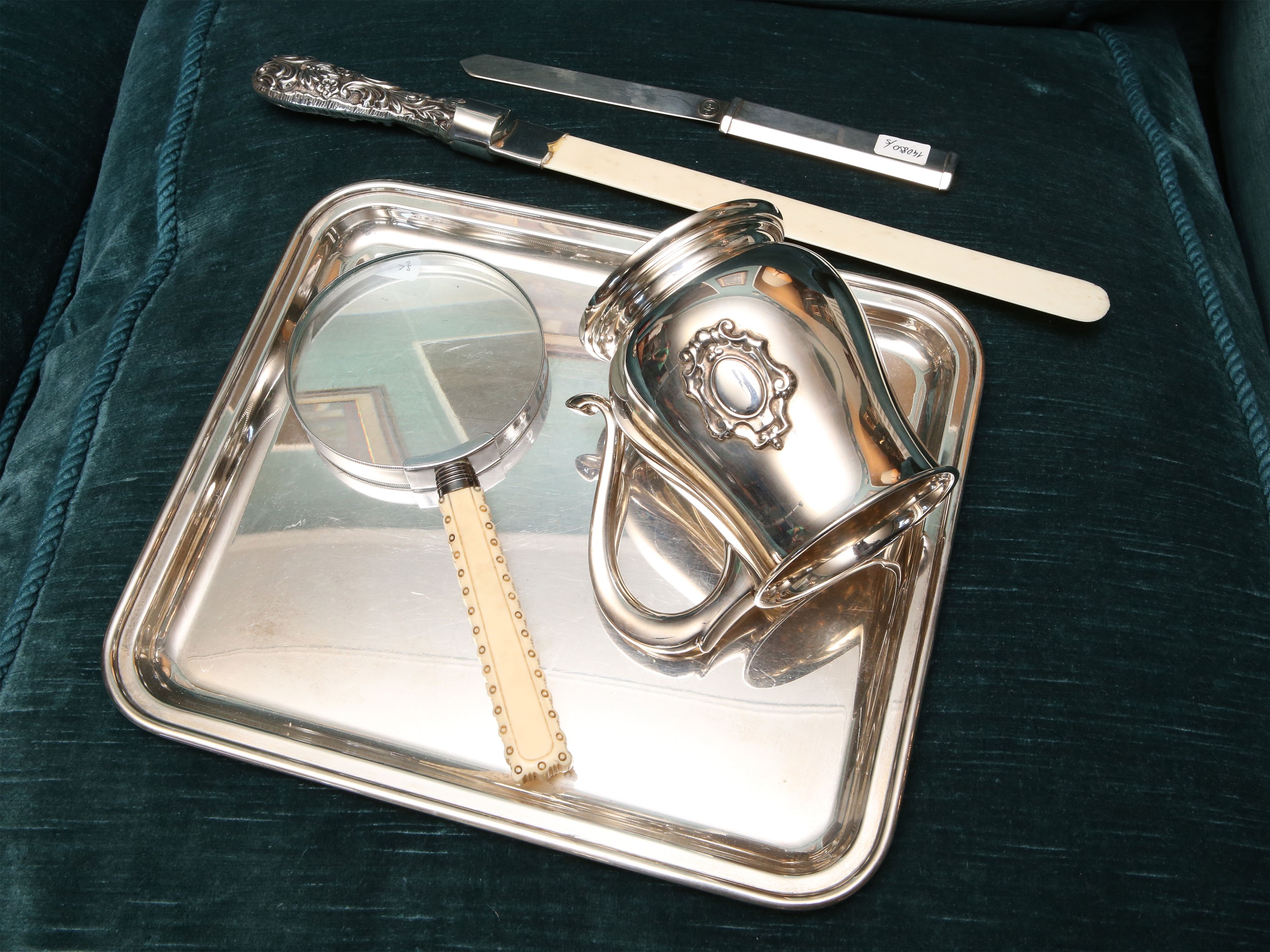 composto da un vassoietto per la posta, un boccale portapenne, due tagliacarte di cui uno di grandi dimensioni con manico cesellato ed una lente di ingrandimento