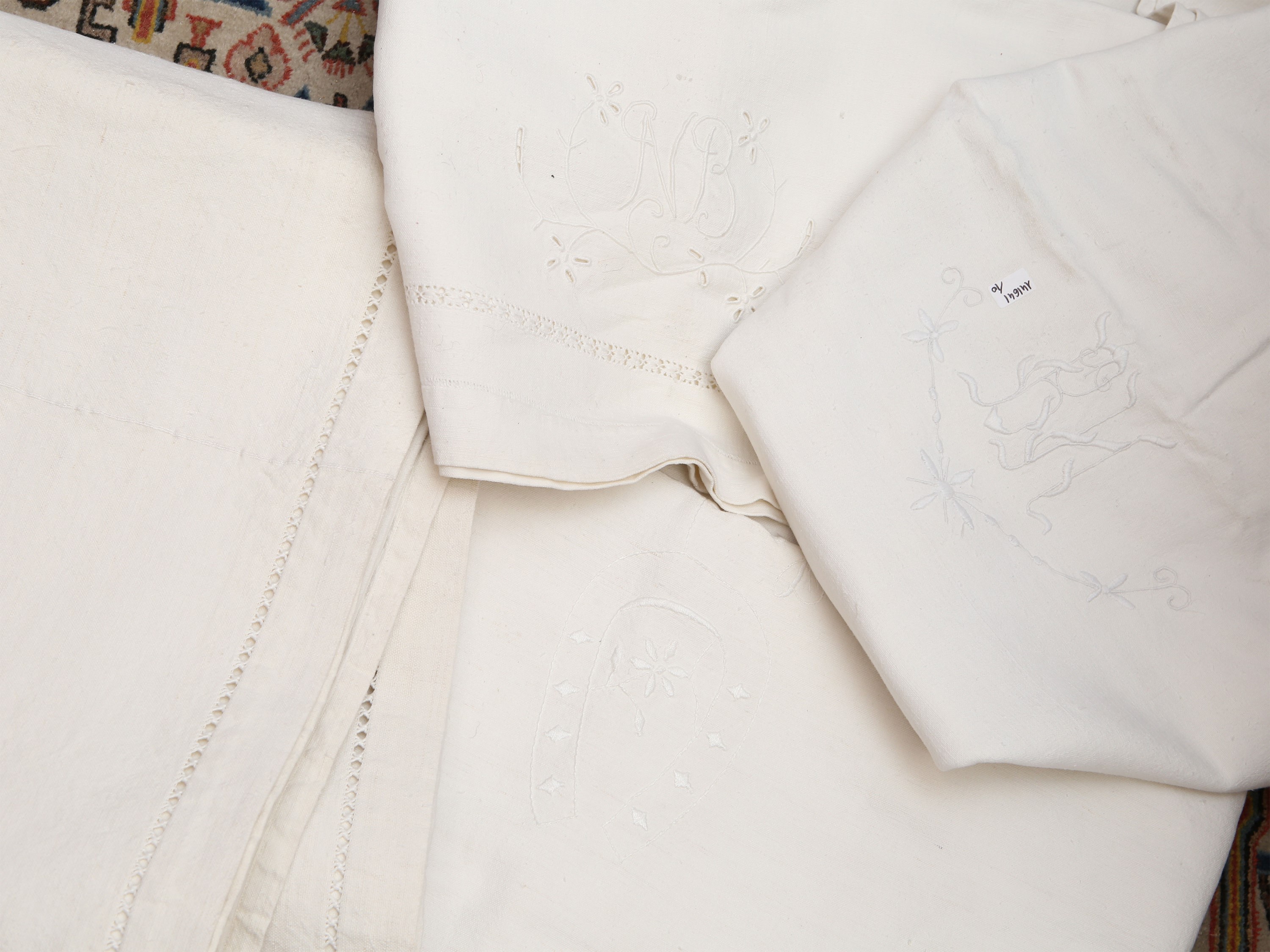parure matrimoniale cm 260x240, federe cm 78x52 circa metà del XX secolo composto da sette lenzuola in lino grezzo di varia misura con sfilature e cifre ricamate ed un lenzuolo matrimoniale in lino corredato di due federe, lievi difetti e macchie (10)