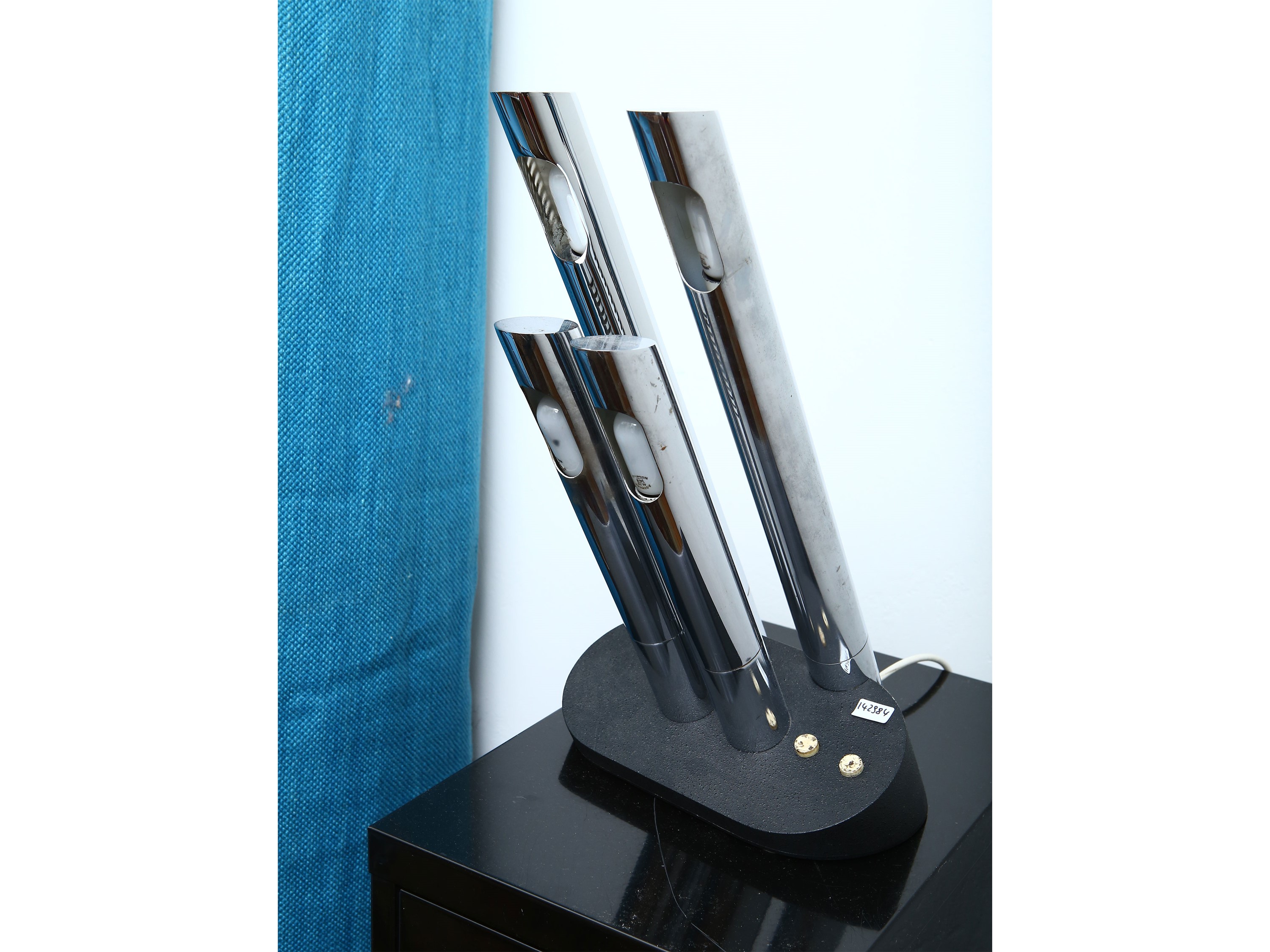 Anni Settanta realizzato come quattro canne in metallo cromato su base inclinata in metallo patinato, reca marchio sotto la base
