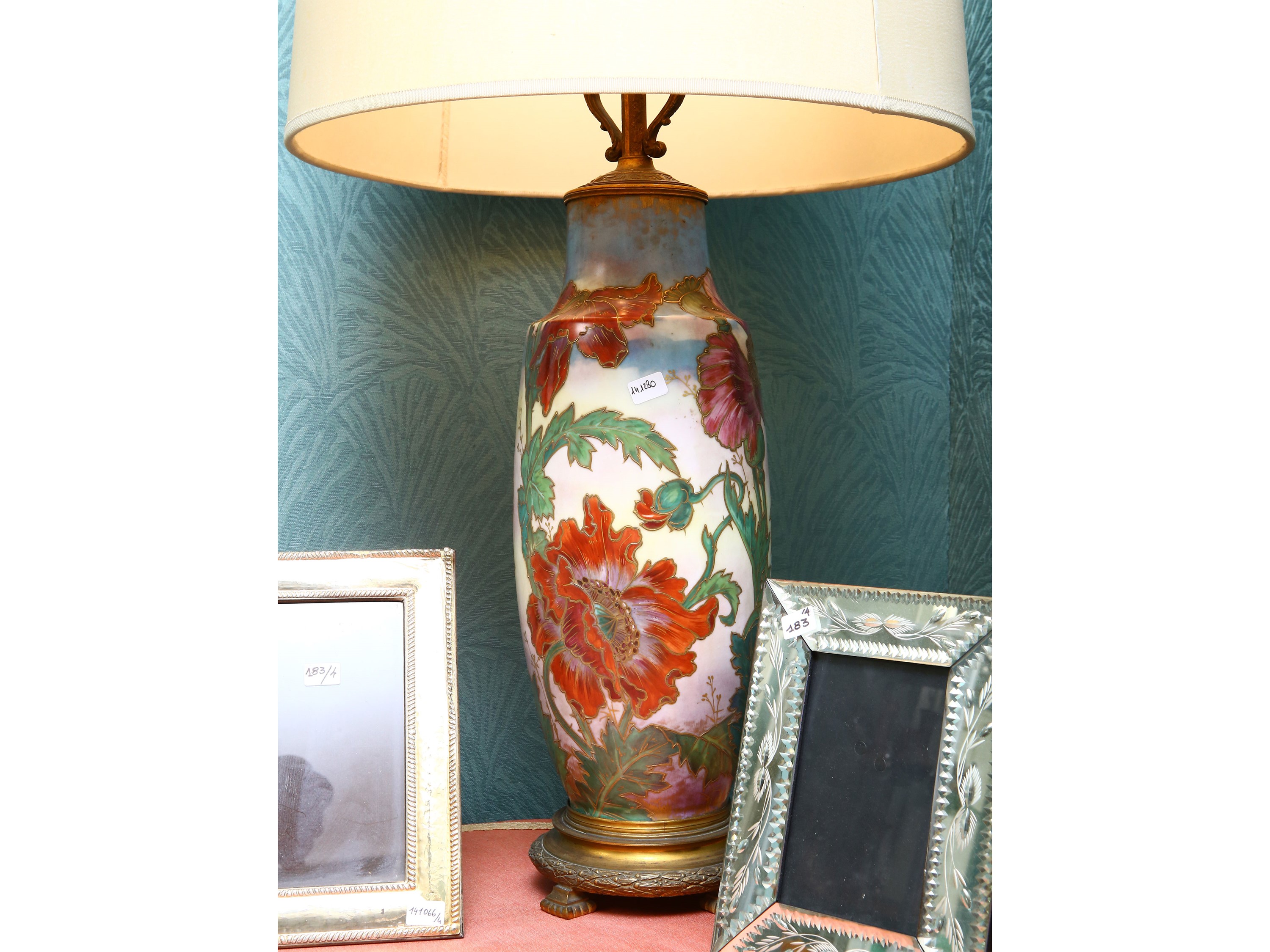 inizio del XX secolo decorato con motivi liberty di fiori e libellule su fondo sfumato, rilegato in bronzo dorato, corredato di paralume