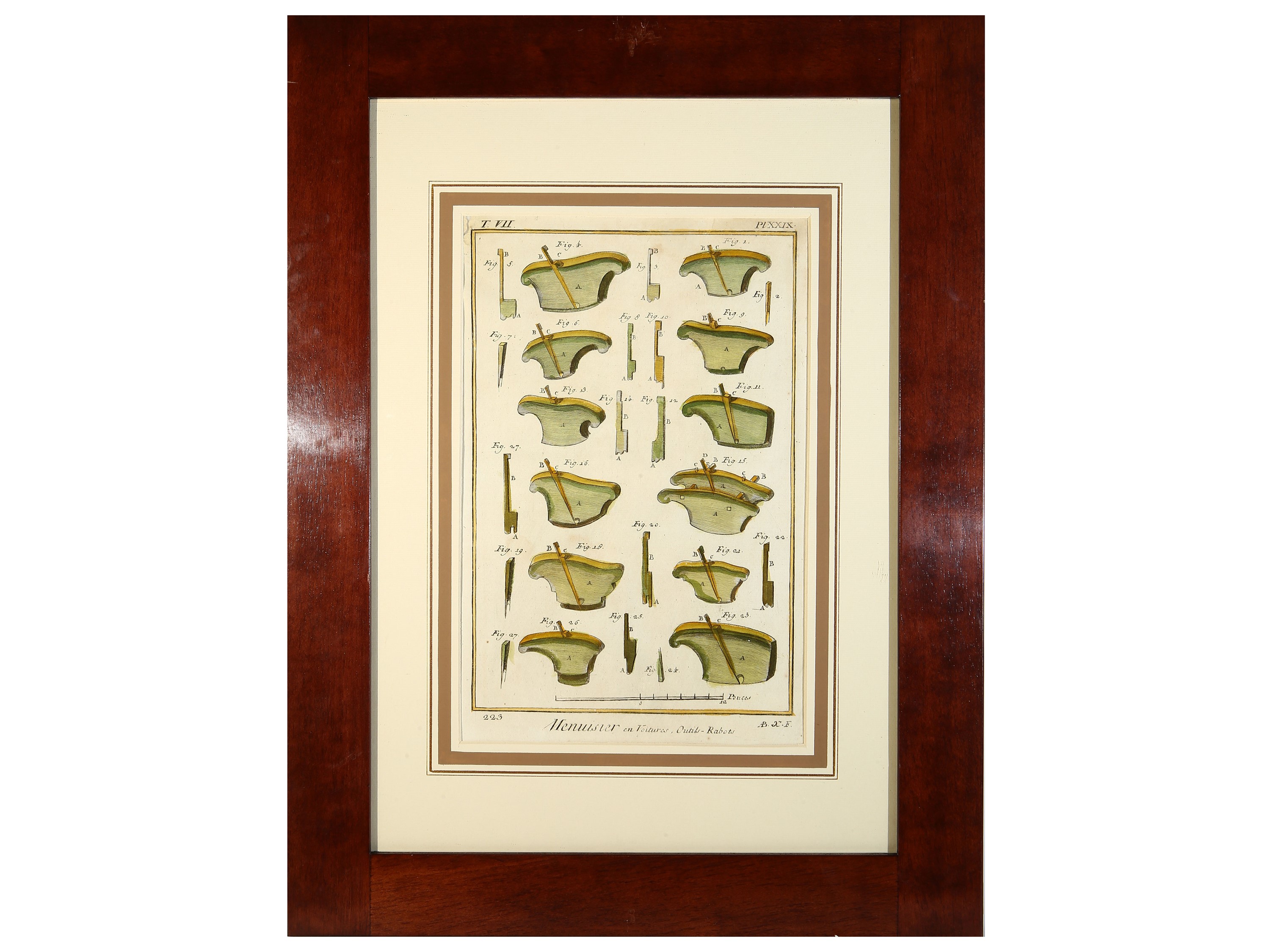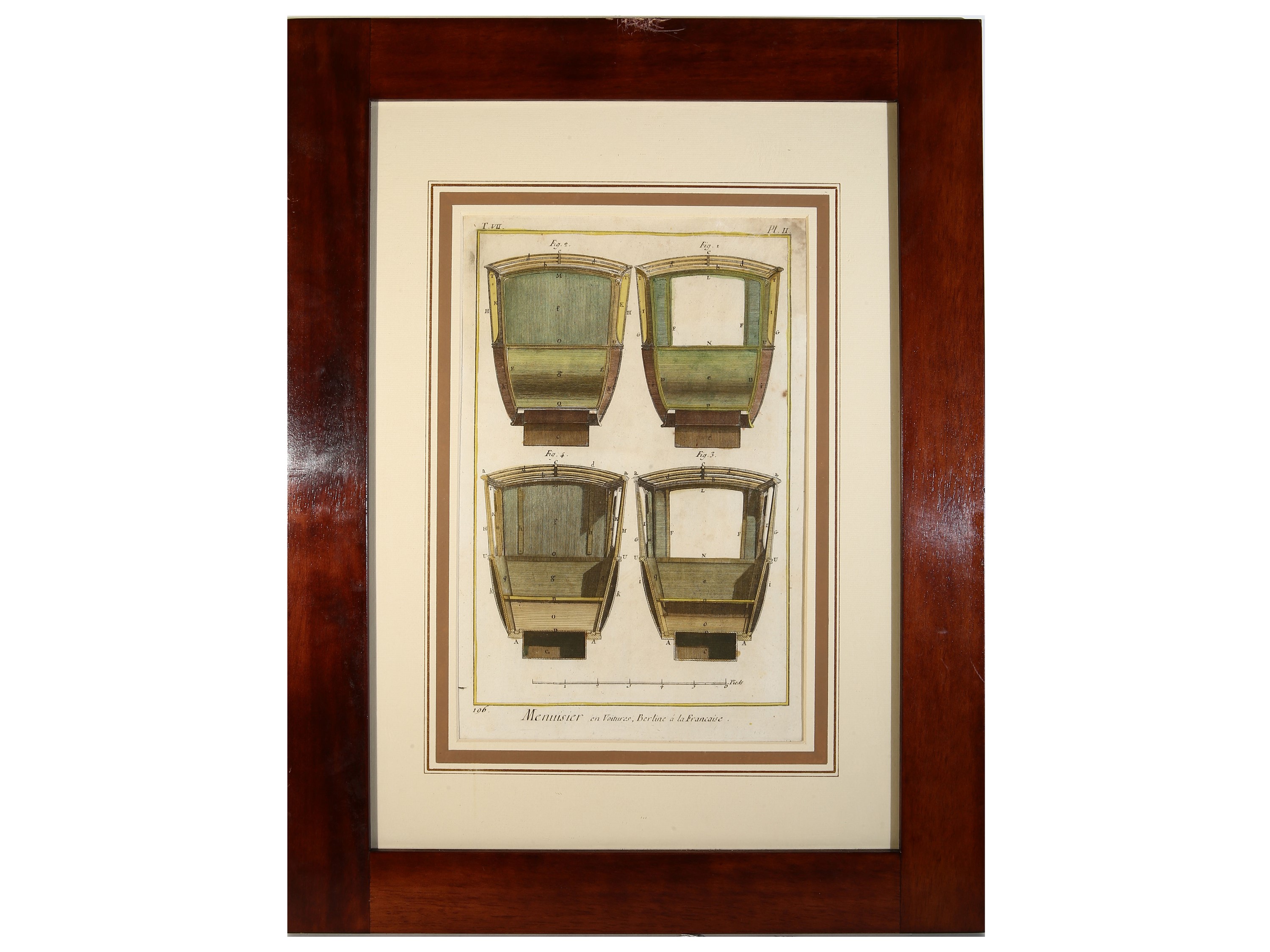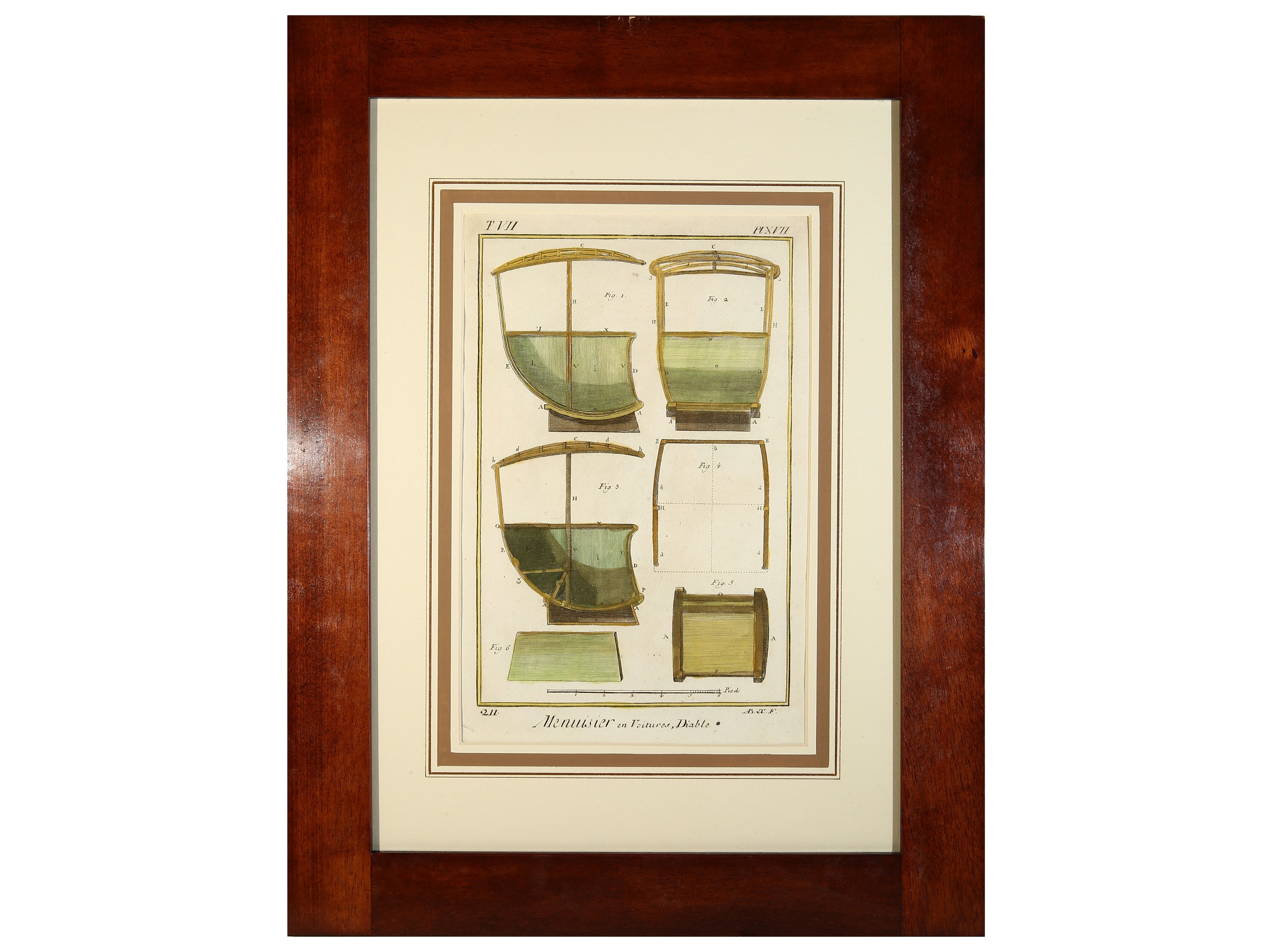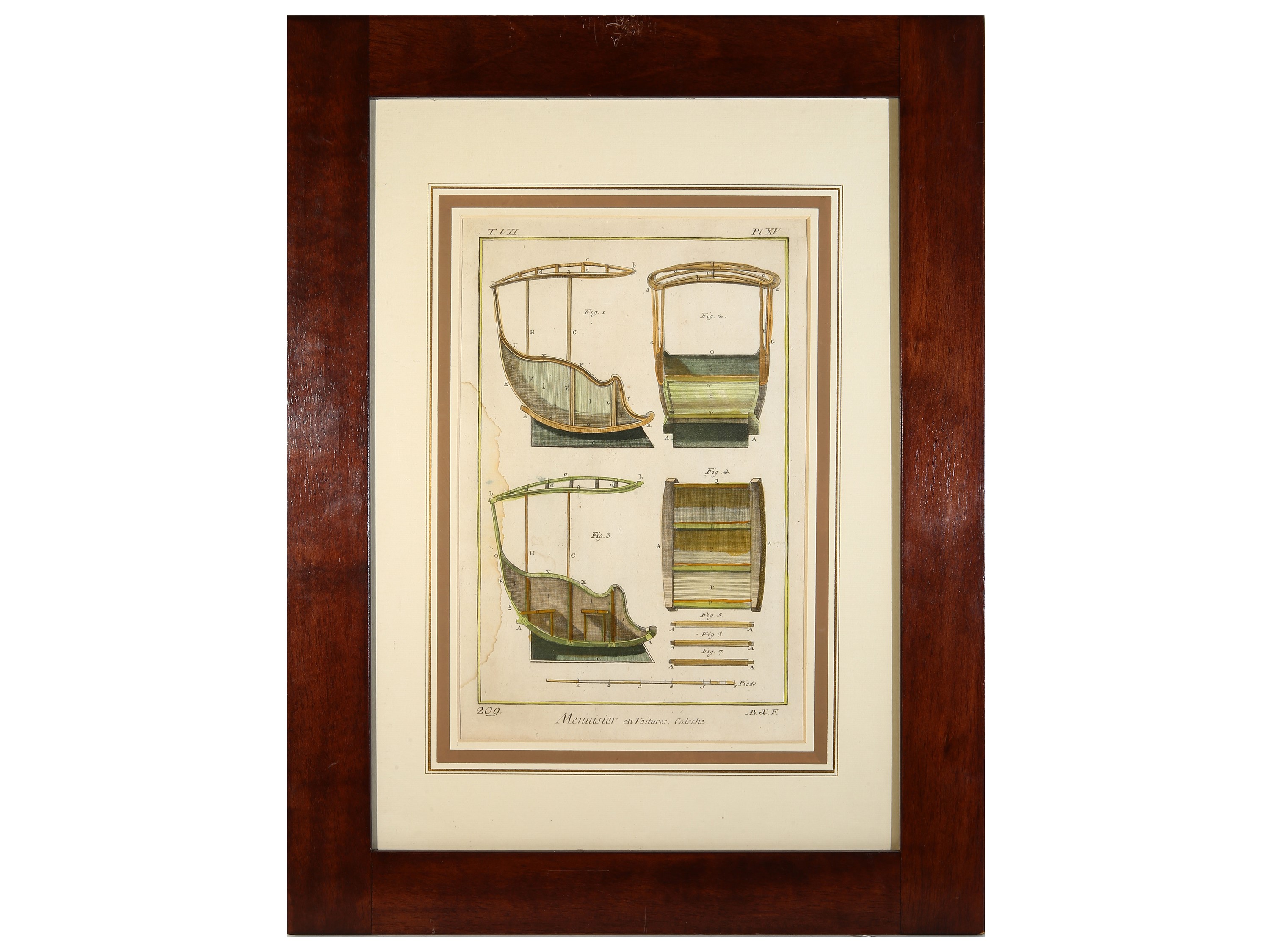XVIII secolo cinque incisioni con acquerellatura, in cornice, alcuni difetti