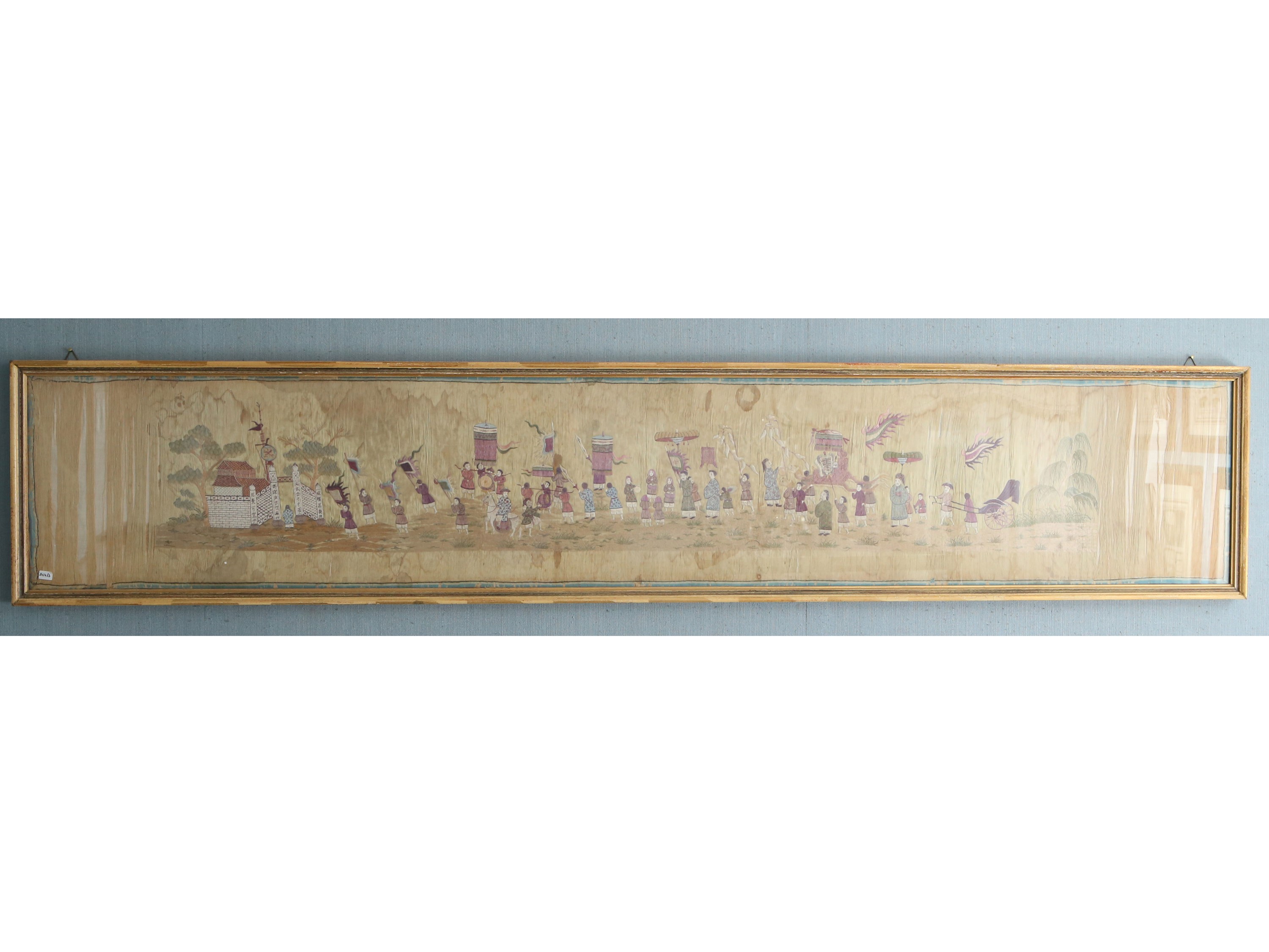 Cina, fine del XIX/inizio del XX secolo raffigurante un corteggio ricamato nei toni del bianco, beige e lilla su fondo tabacco, difetti, in cornice
