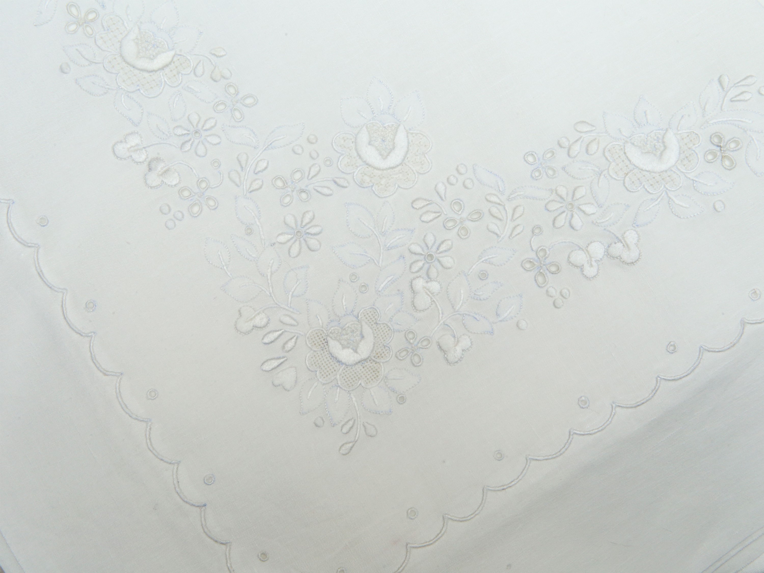 seconda metà del XX secolo composta da lenzuolo e coppia di federe en pendant, ricamata a telaio a mano con motivi floreali