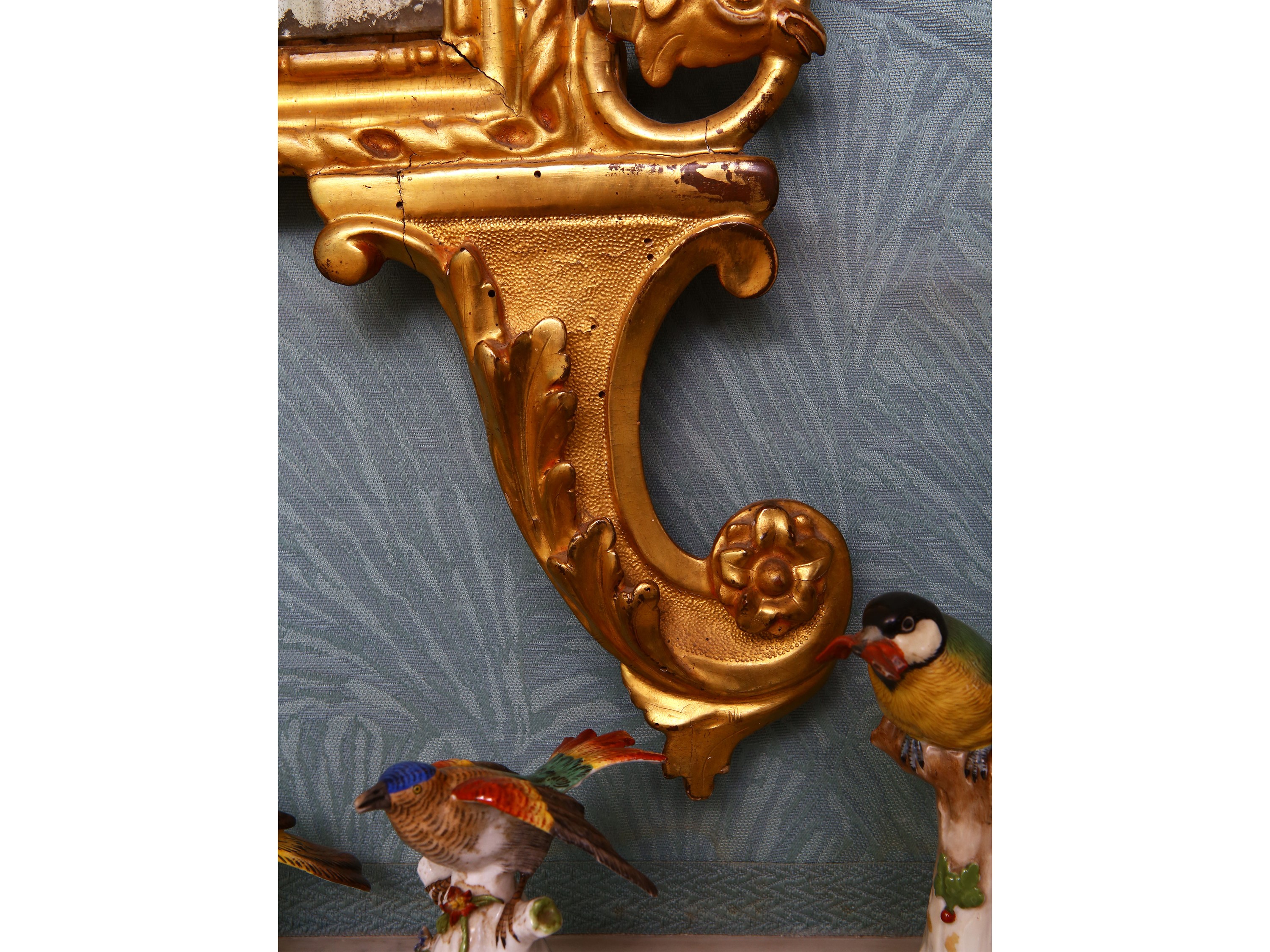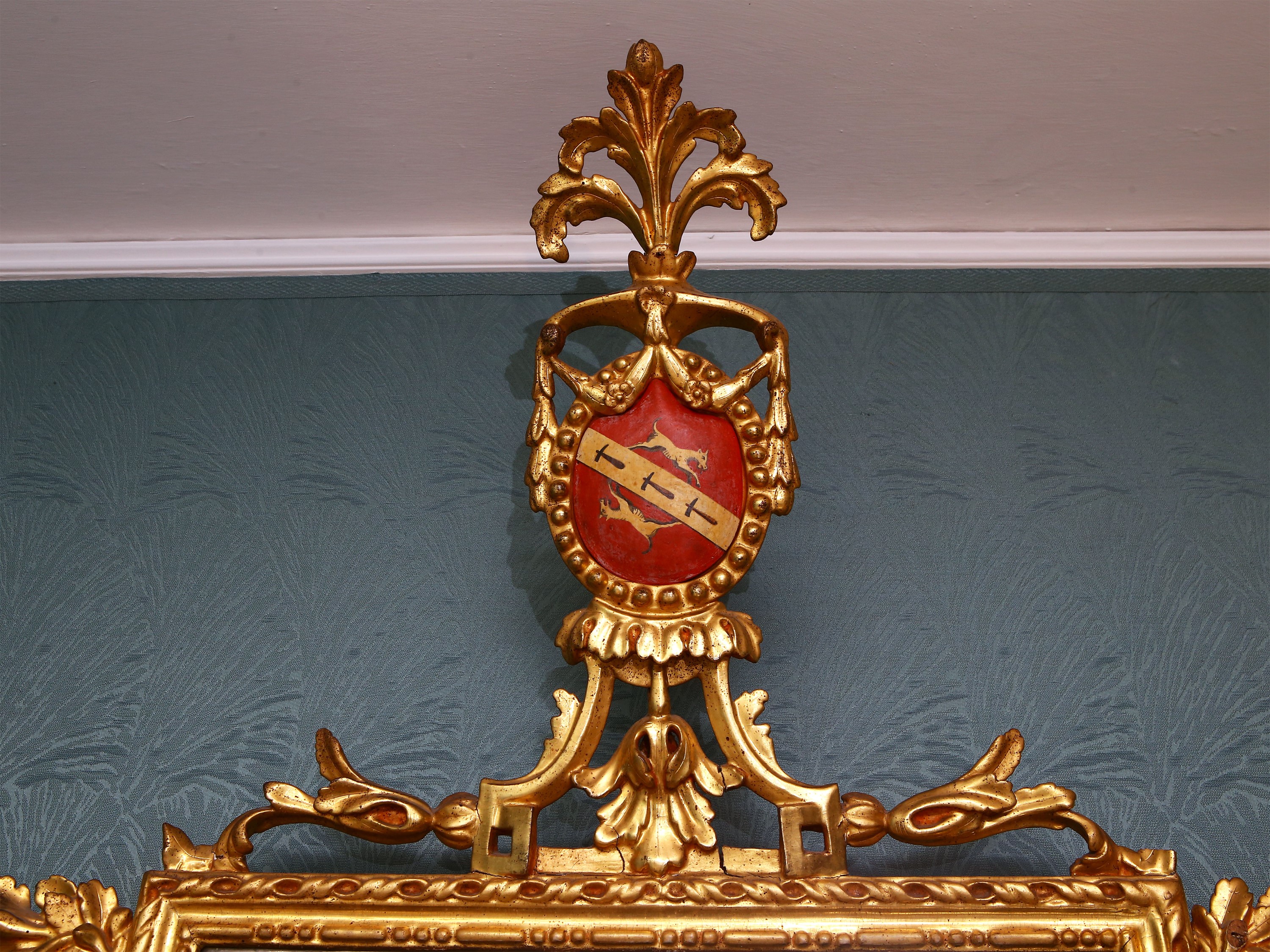 cm 145x76 seconda metà del XVIII secolo alta cimasa desinente a stemma gentilizio dipinto nei toni del rosso probabilmente in epoca posteriore, sormontato da trionfo vegetale, cornice intagliata con profili antropomorfi da cui si dipartono ghirlande di foglie ricadenti ai lati, bordo interno a nastro, su alti piedi a foggia di cornucopia, specchio al mercurio